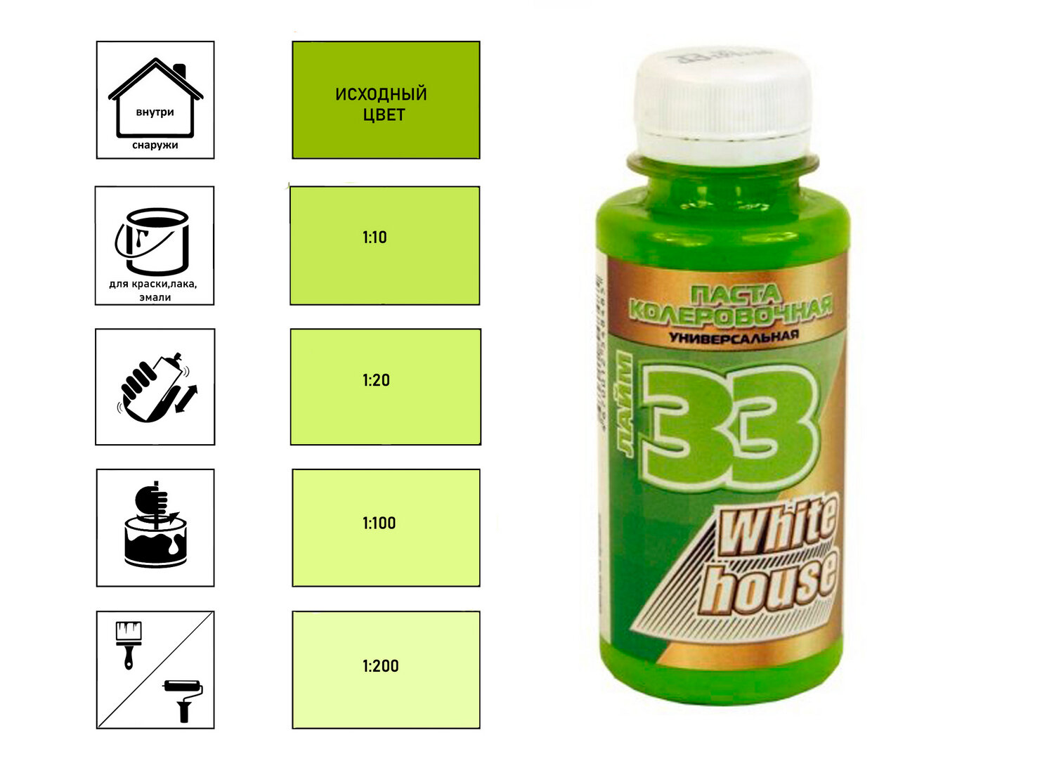 Универсальный колер White House "Лайм", для красок, штукатурок, лаков и др, 100 мл