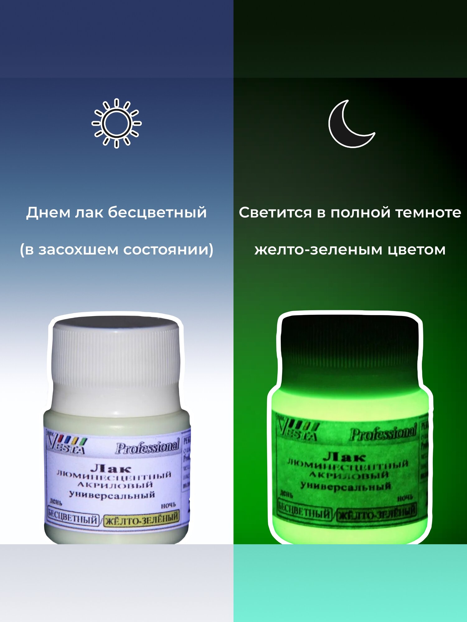 Лак люминесцентный "VESTA PROFESSIONAL" бесцветный / желто-зеленый (день / ночь) - 50 мл