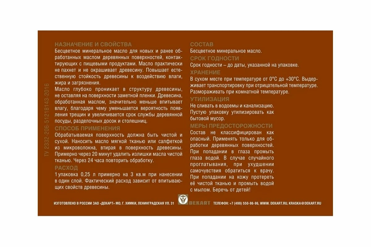 | Дополнительная информация | Идеально для нанесения на деревянные столешницы и посуду, разделочные доски, стойкое к многократному мытью, на основе натурального масла |