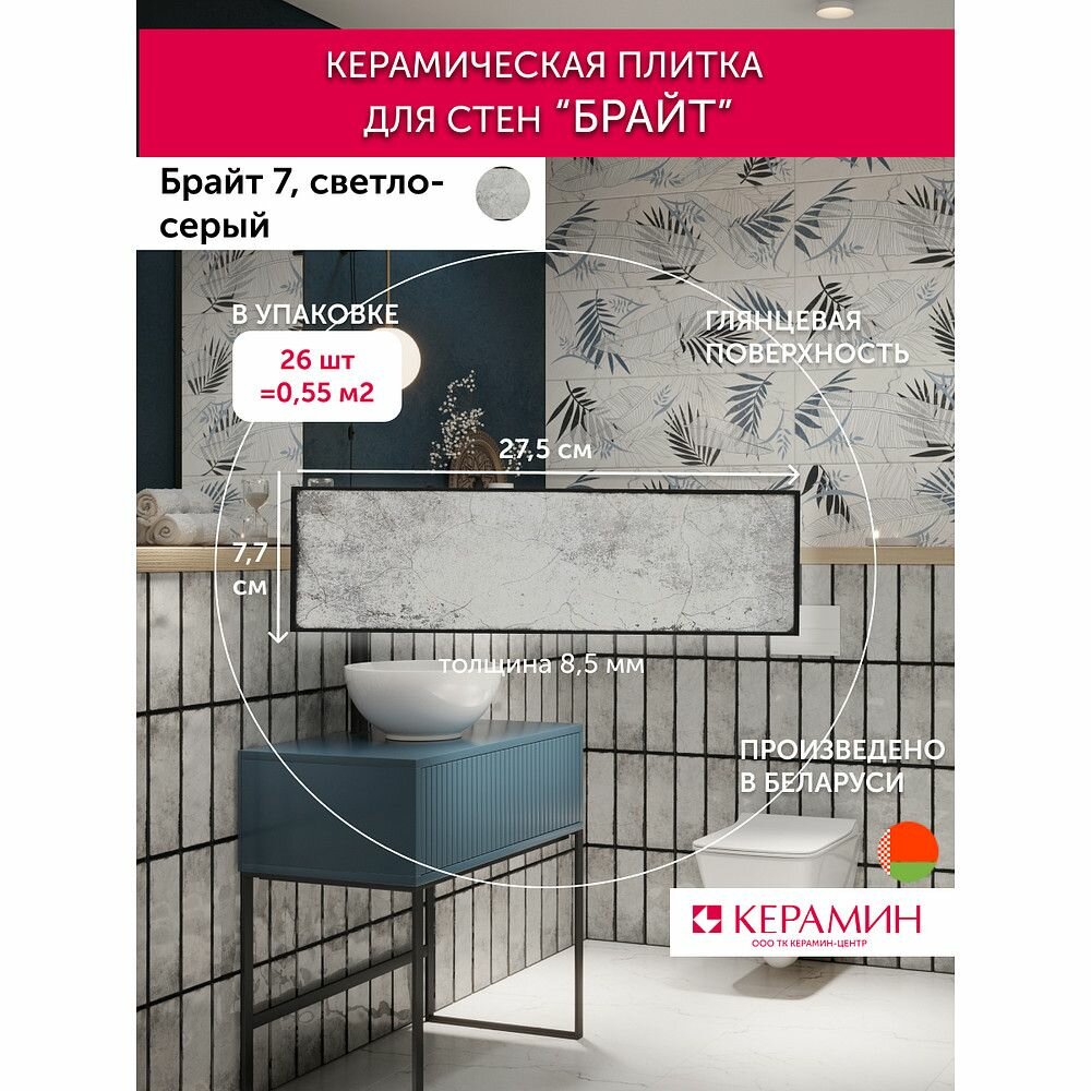 СохранитьПлитка керамическая для стен Керамин Брайт 7 светло-серый 275х77,5 мм 26 шт (0,55 м2) интересное: