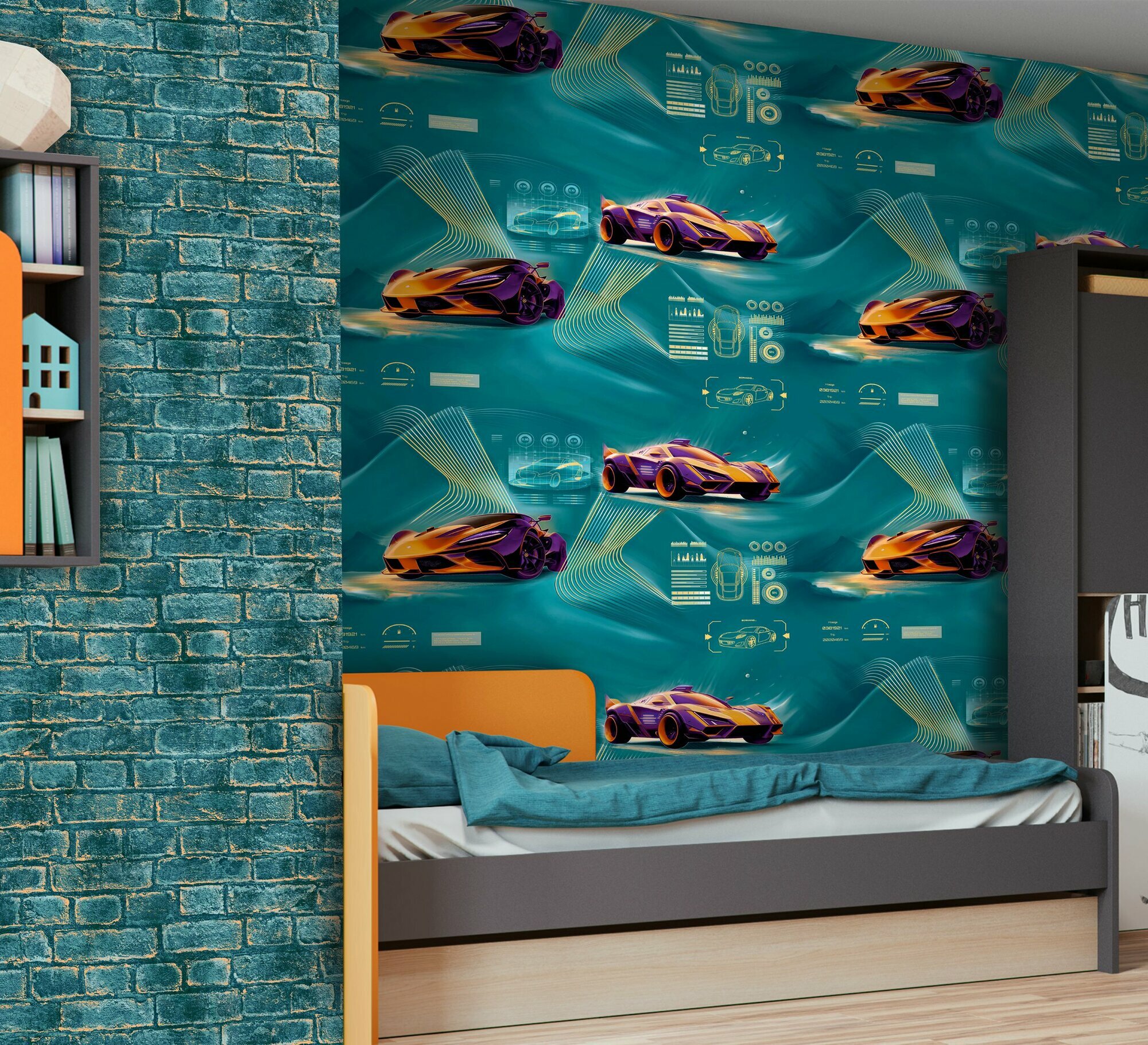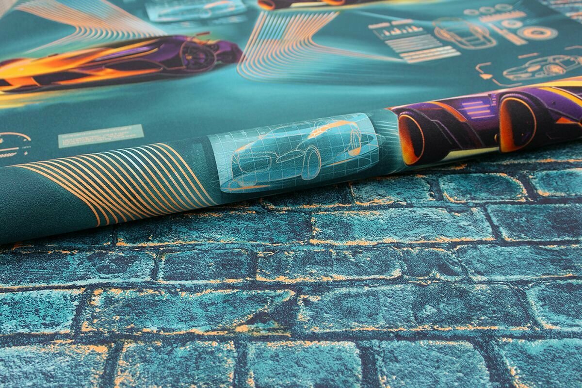 Купить Обои виниловые в подростковую комнату с машинами104 УФ-свечение 1,06*10м метровые для мальчика бирюзовые