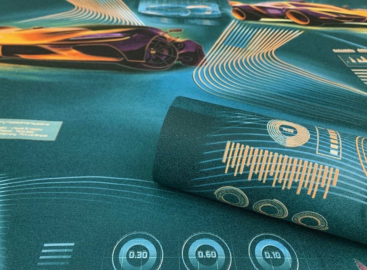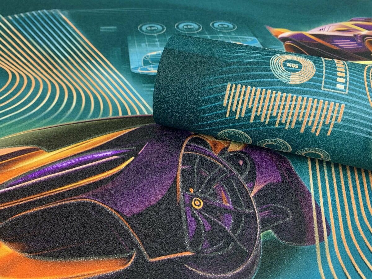 Обои в подростковую комнату светящиеся виниловые гоночные машины105 тачки УФ-свечение 1,06*10м, метровые для мальчика в бар в клуб фиолетовые