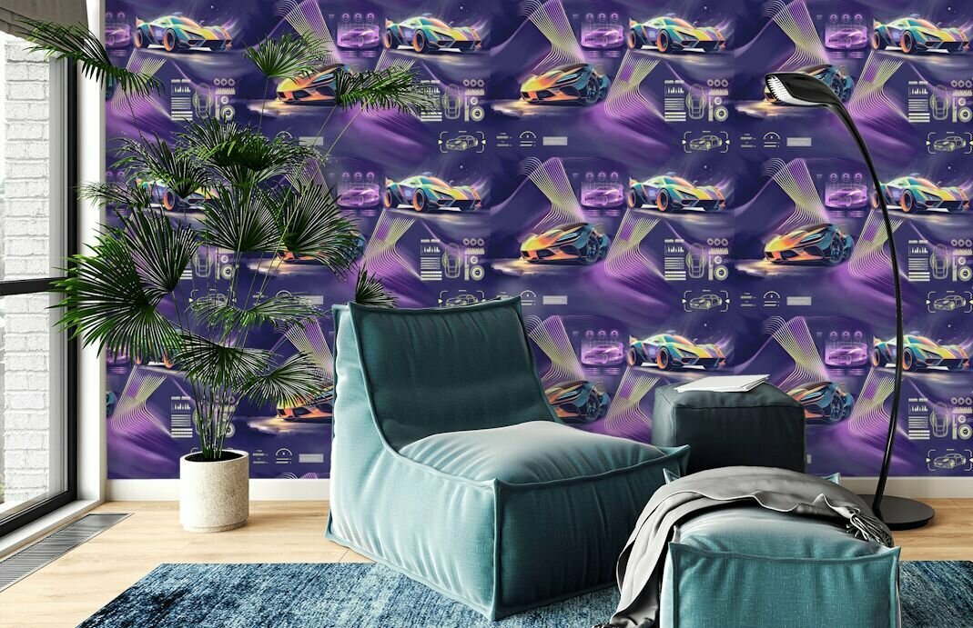 Обои в детскую комнату светящиеся гоночные машины105 фиолетовые 1,06*10м для мальчика в бар в клуб