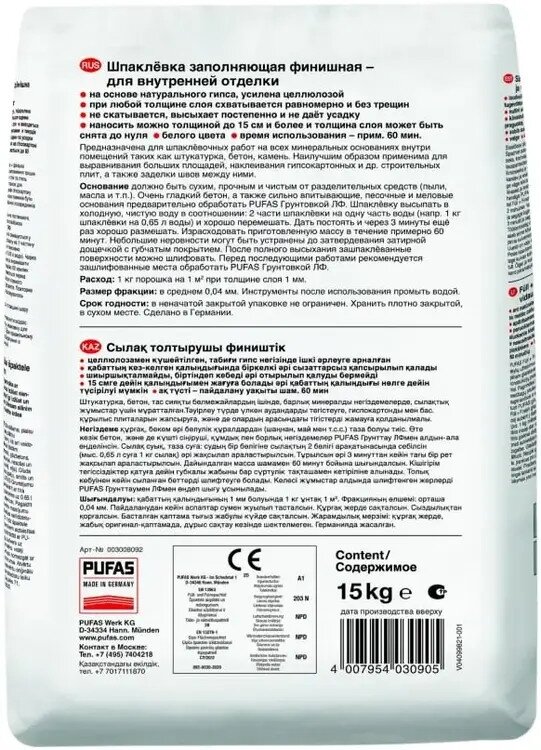 Шпатлевка для стен и потолка Pufas Füll + Finish 15кг, гипсовая белая финишная Германия интересное: