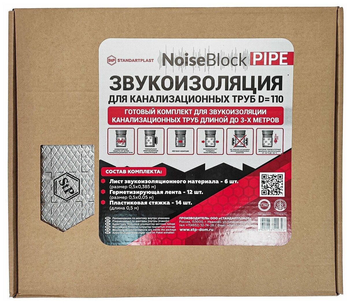 | Дополнительная информация | Комплект предназначен для звукоизоляции систем водоотведения и канализации. Основной материал состоит из трех слоев: звукопоглощающего слоя, тяжелой звукоизолирующей полимерной мембраны и теплоизолирующего металлизированного лицевого слоя. Многослойный материал снижает уровень шума в три раза и обеспечивает дополнительную теплоизоляцию. В комплект входят 6 листов шумоизоляционного материала, 12 герметизирующих лент, 12 пластиковых стяжек. Комплект рассчитан на обработку трубы диаметром 110 мм длиной до 3 м. Материал устойчив к перепадам температур от -40 до +80°С, экологичен, легко монтируется, не требует установки звукоизоляционных кожухов. В комплекте 6 листов шумоизоляционного материала 0,5х0,385 м, 11 герметизирующих лент 0,5х0,05 м, 12 пластиковых стяжек 0,5 м. Состав материал состоит из звукопоглощающего слоя, тяжелой звукоизолирующей полимерной мембраны на основе эластомерной композиции, теплоизолирующего лицевого слоя. |