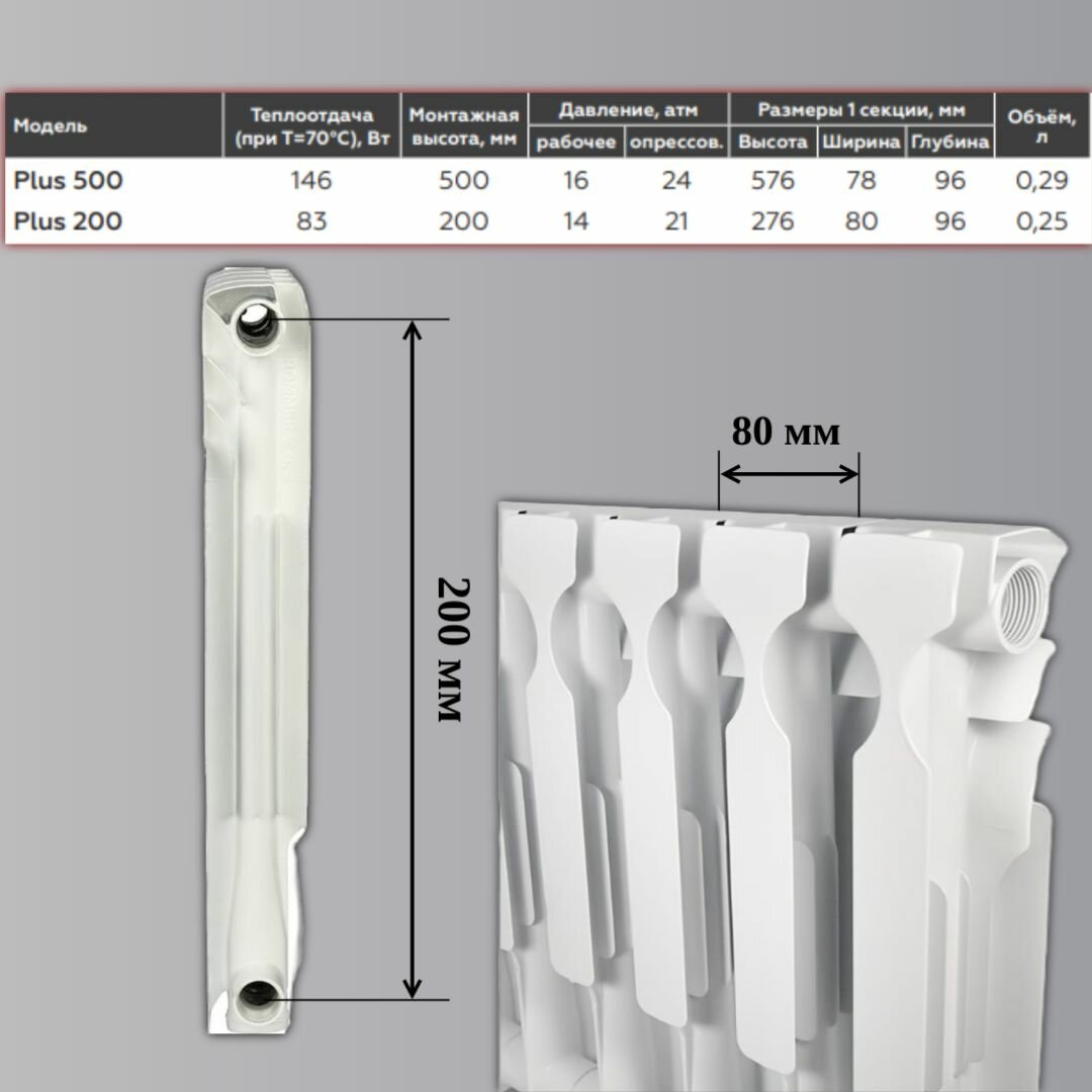 Радиатор секционный биметаллический Plus BM 200 10 секций параметры 256х790х96 боковое подключение Сантехническая нить 20 м