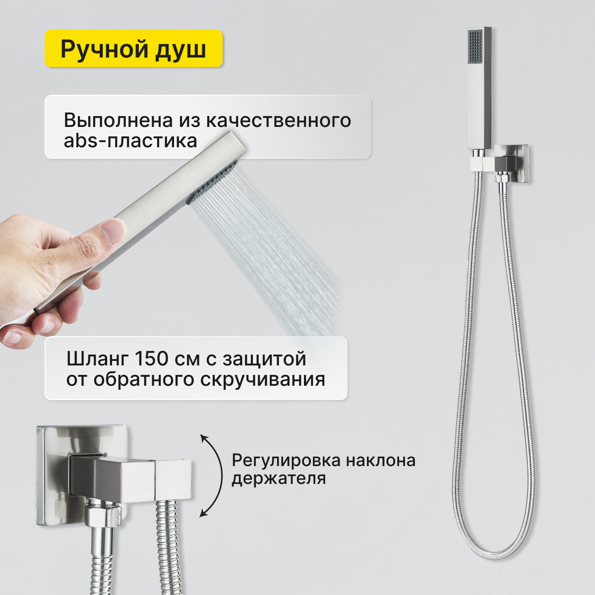 | Особенности | держатель душевой лейки / защита от скручивания / регулируемый верхний душ |