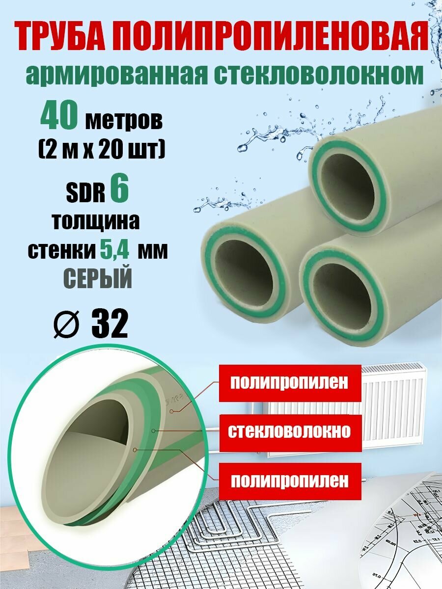 СохранитьТруба 32 мм полипропиленовая, армированная стекловолокном (для отопления), SDR 6, 40 метров (2 м х 20 шт) / Tebo (серый) интересное: