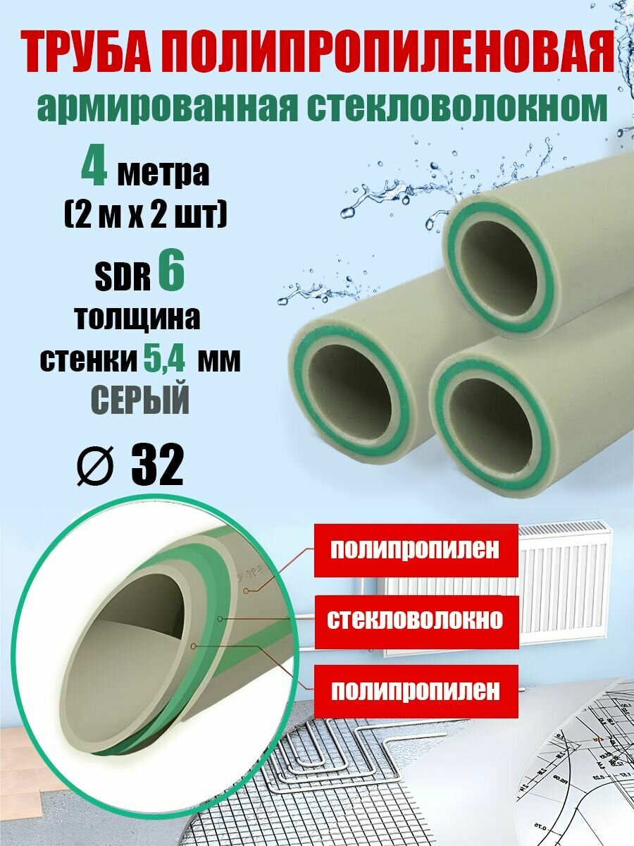 Купить Труба 32 мм полипропиленовая, армированная стекловолокном (для отопления), SDR 6, 4 метра (2 м х 2 шт) / Tebo (серый)