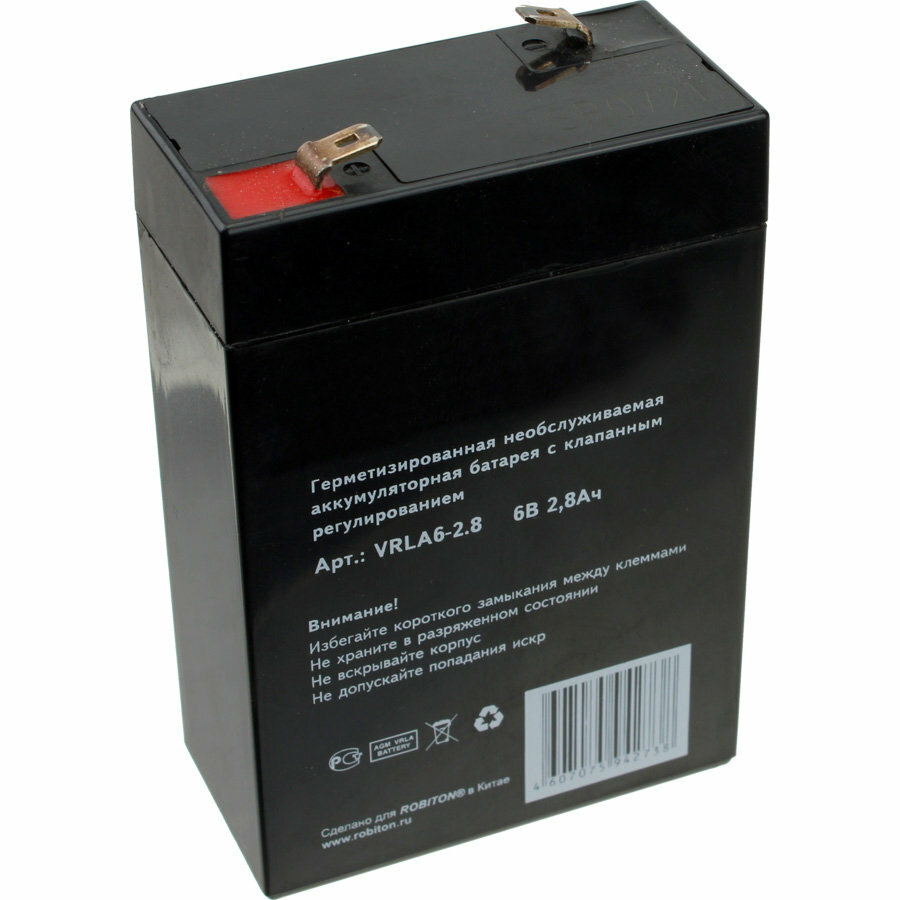 Аккумулятор AGM ROBITON VRLA6-2.8 7625, 6В, 2.8Ач, свинцовый, кислотный, герметичный, необслуживаемый