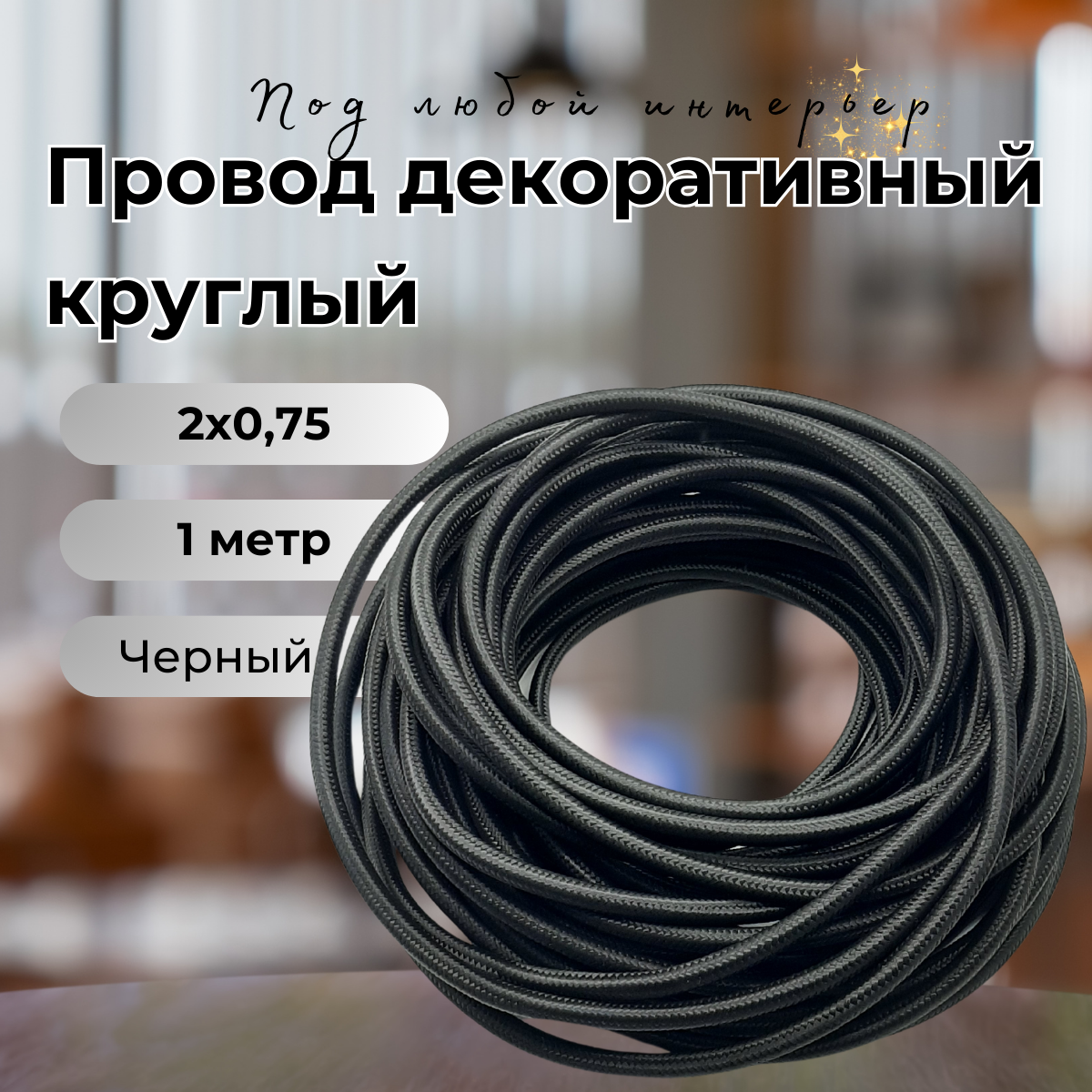 Провод декоративный круглый в тканевой оплетке 2*0,75, 3 м/уп, цвет черный