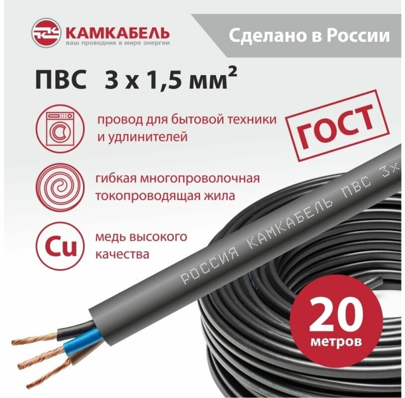 Электрический провод Камкабель ПВС 3 х 1,5 кв. мм, 20 м