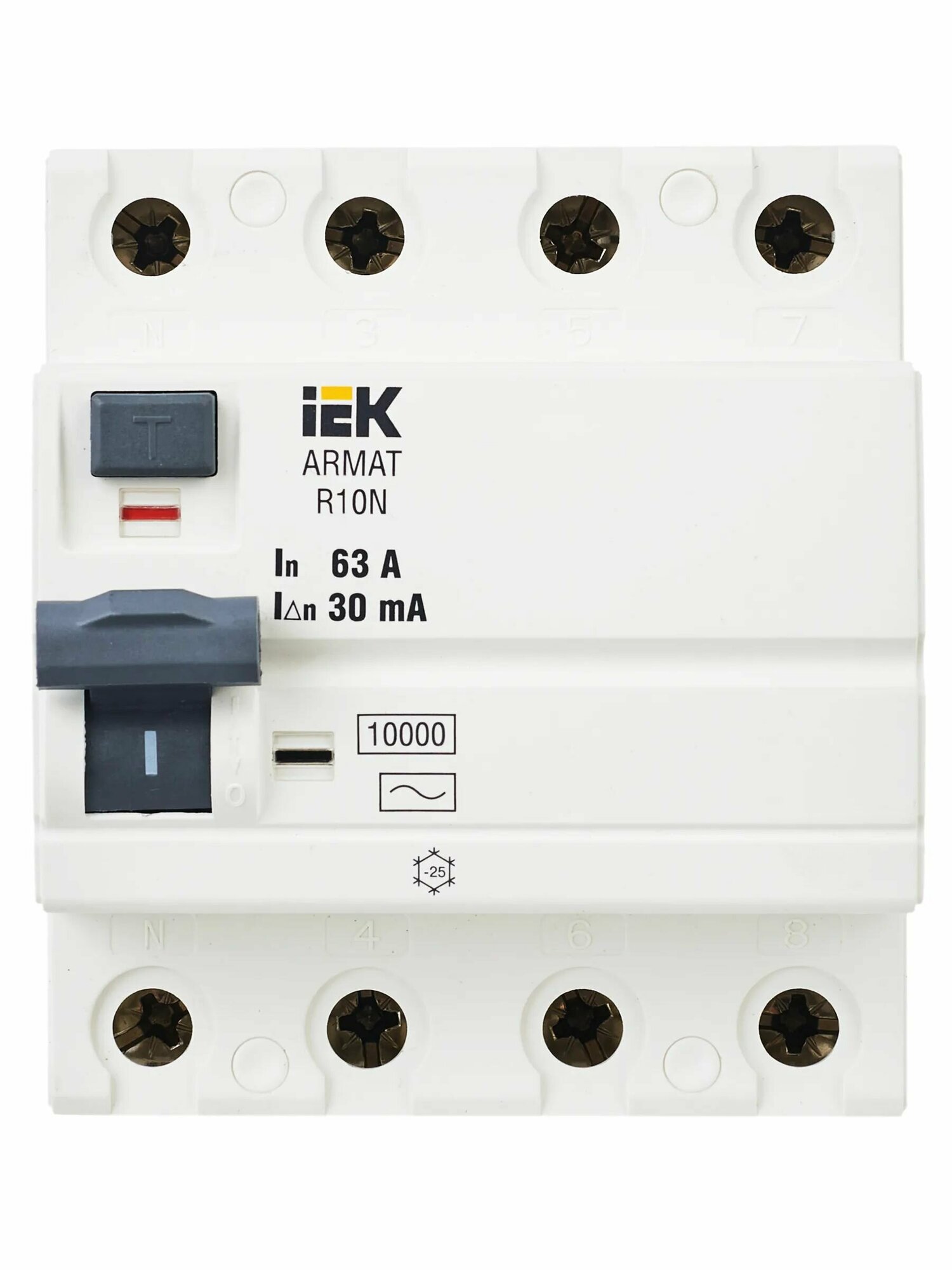 Выключатель дифференциального тока (УЗО) 4п 63А 30мА тип AC ВДТ R10N ARMAT, IEK AR-R10N-4-063C030 (1 шт.)