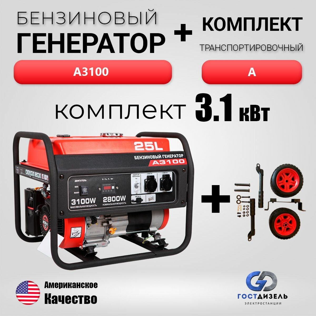 Комплект: Бензогенератор A3100 (3100 Вт), ручной запуск + Транспортировочный комплект A интересное: