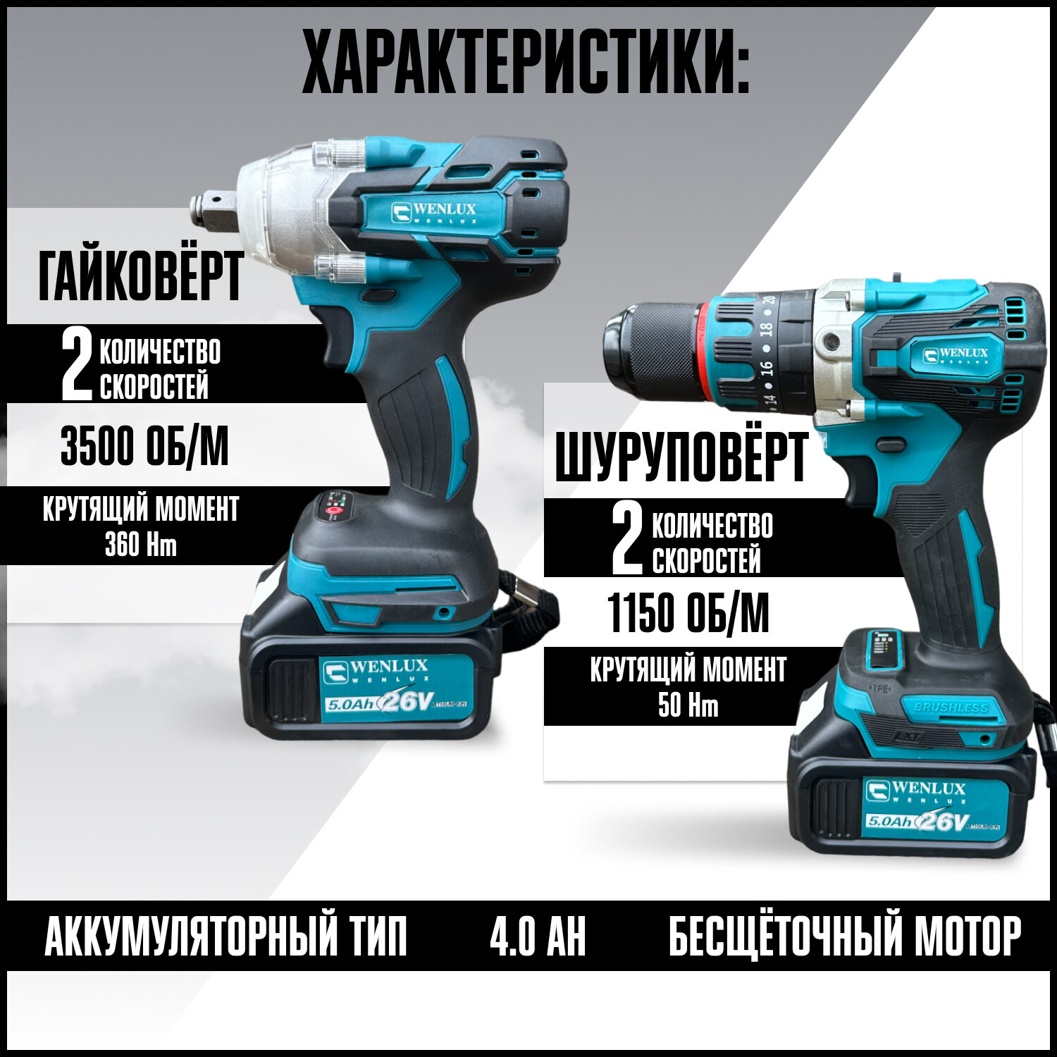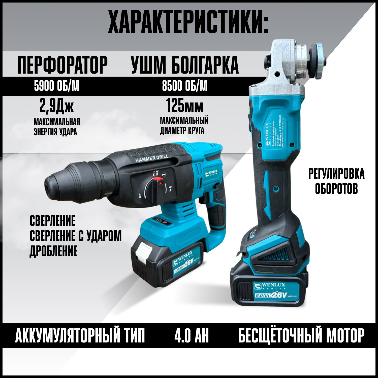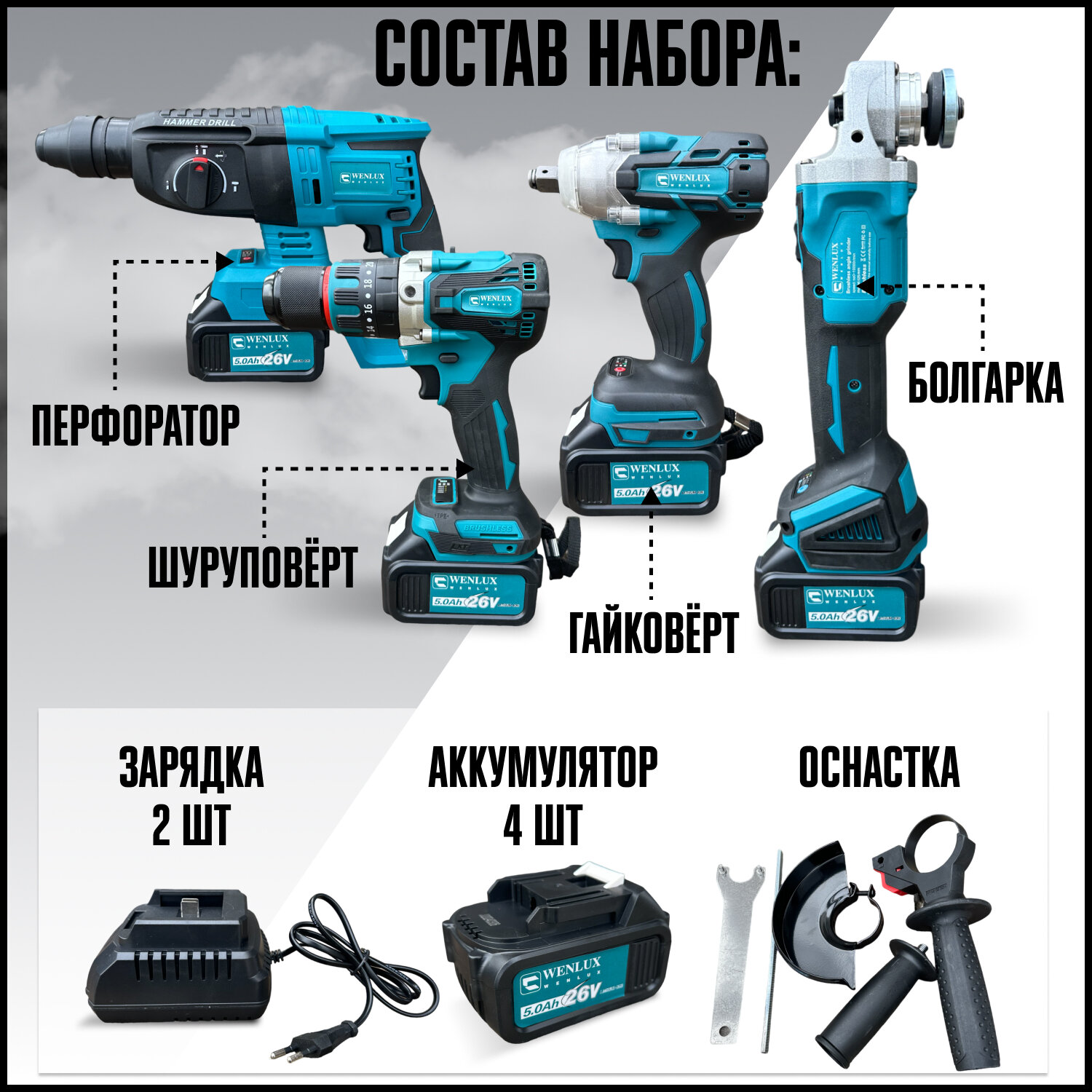 Набор электроинструментов 4в1 WENLUX / Шуруповерт, Гайковёрт, Перфоратор, Болгарка (ушм) / 4 аккумулятора интересное: