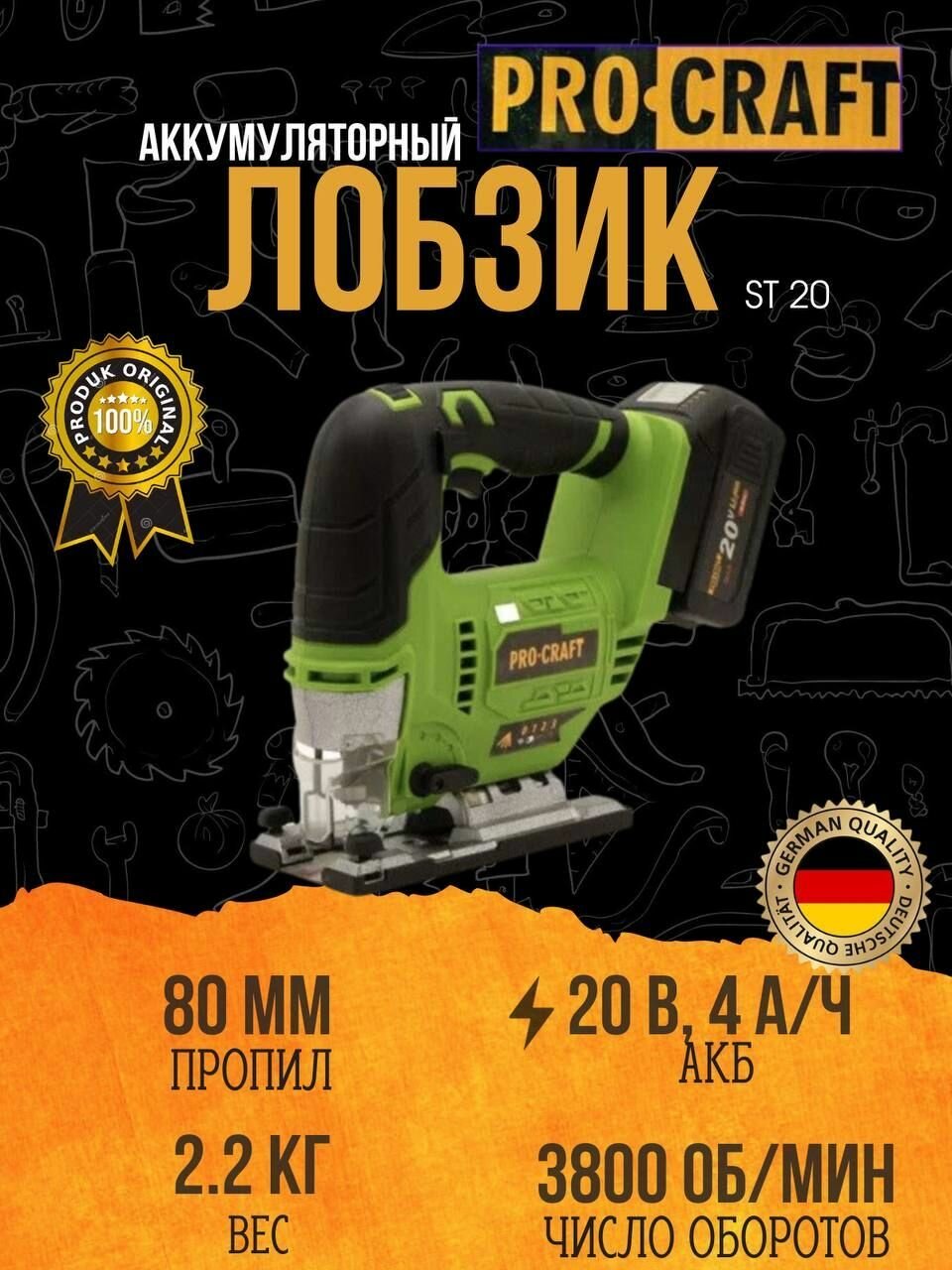 Купить Лобзик аккумуляторный Procraft ST-20 (1 АКБ + ЗУ), подсветка, 60мм, 3800об/мин