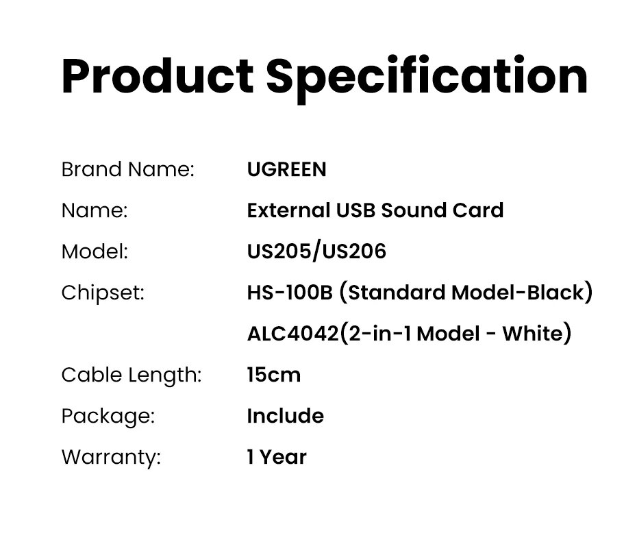 UGREEN USB Звуковая карта US205, 2Ports 15cm