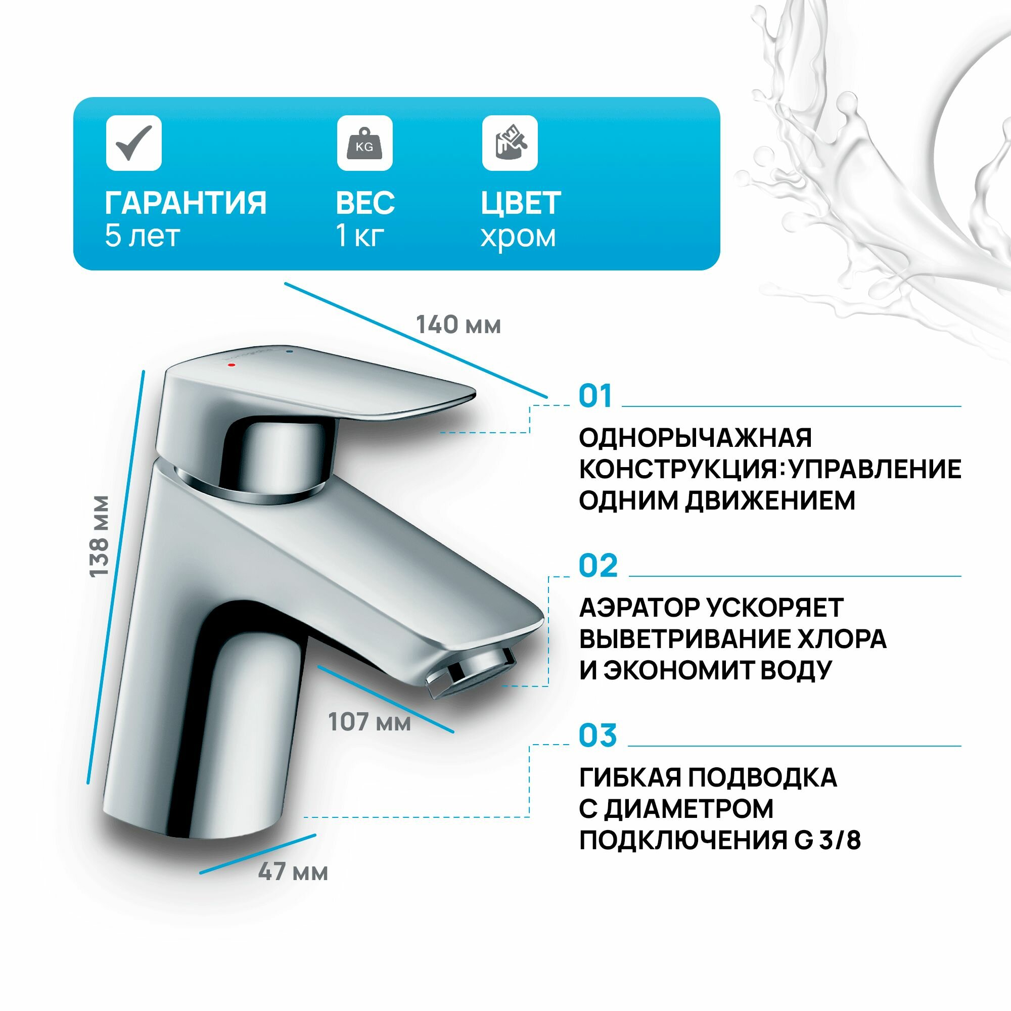 Смеситель для раковины Hansgrohe Logis 70, однорычажный, без сливного набора, хром 71071000
