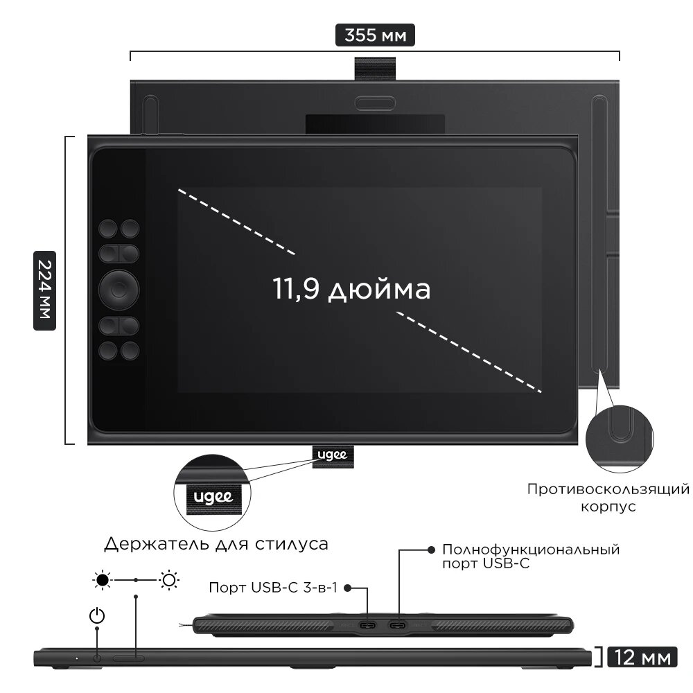 Графический планшет UGEE UE12 Plus, цифровой планшет для рисования с HD-экраном 11,9 дюйма, 127% ГБ, sRGB 8192, поддержка Windows/mac/Android интересное: