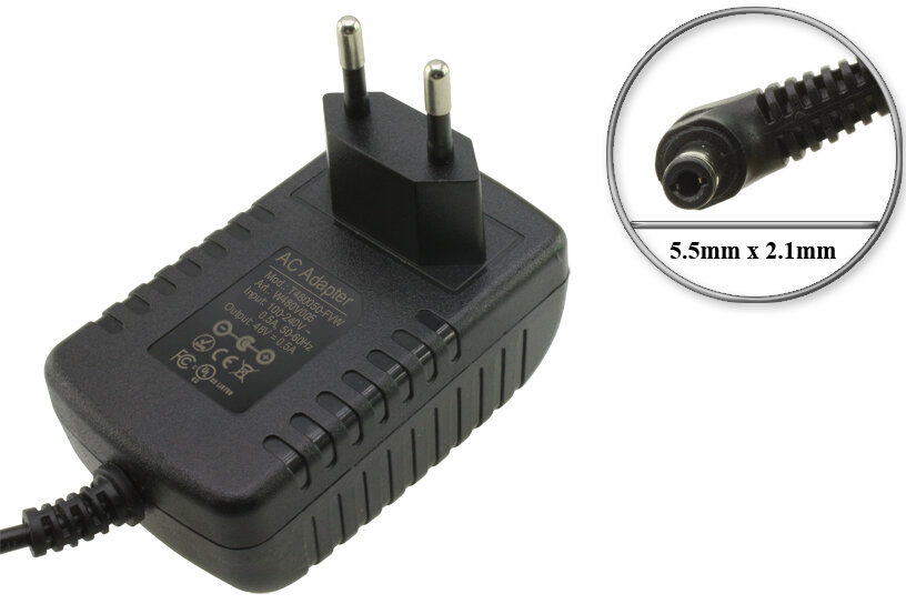 Адаптер (блок) питания 48V, 0.5A, 5.5mm x 2.1mm (T480050-2C1, T480050-FVW), вилка, для PoE сетевого оборудования, IP видеокамеры и др. устройств. интересное: