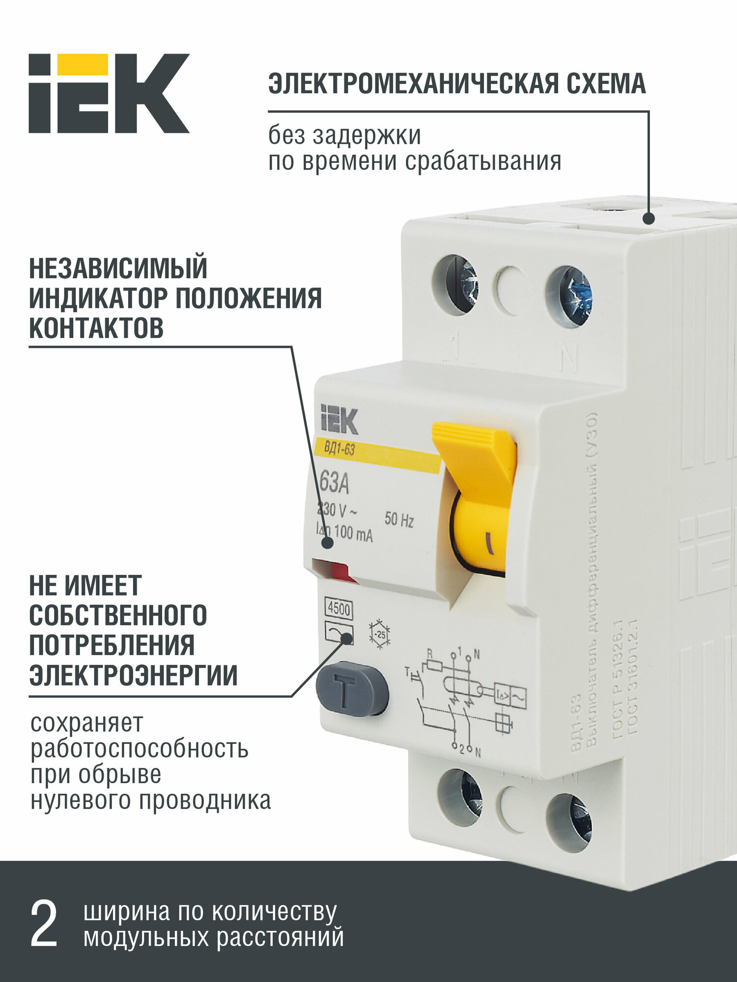 Купить Дифференциальный выключатель нагрузки УЗО ВД1-63 2 полюса, 63А, Тип AC, 100мА | код. MDV10-2-063-100 | IEK ( 1шт. )
