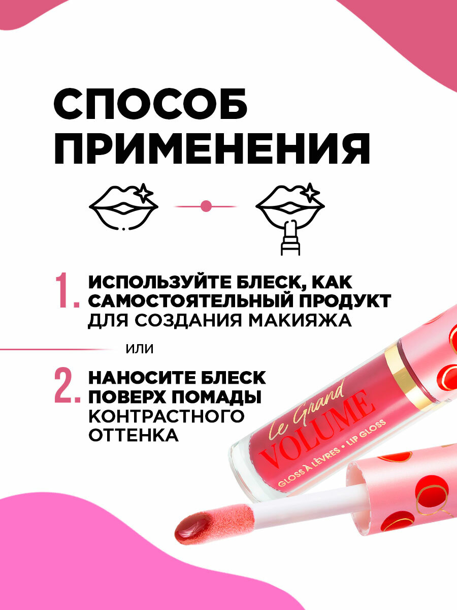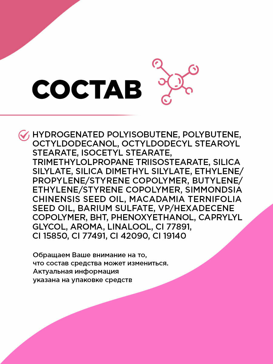 | Способ применения | наносите блеск аппликатором от середины губ к контуру. Для большего объема немного выйдите за границы верхней губы. Блеск можно использовать самостоятельно или наносить поверх помады |