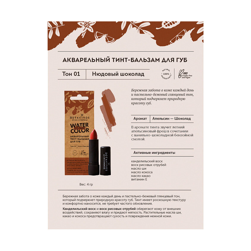 СохранитьТинт-бальзам для губ, тон №1, Нюдовый шоколад, 4 гр,BOTAVIKOS интересное:
