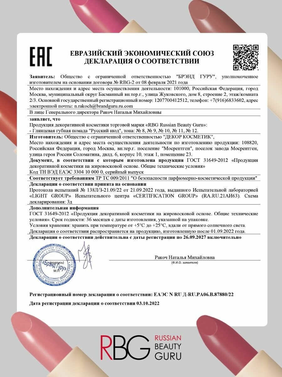 Russian Beauty Guru Помада губная глянцевая русский нюд, 10 Rbg, 4,5 гр