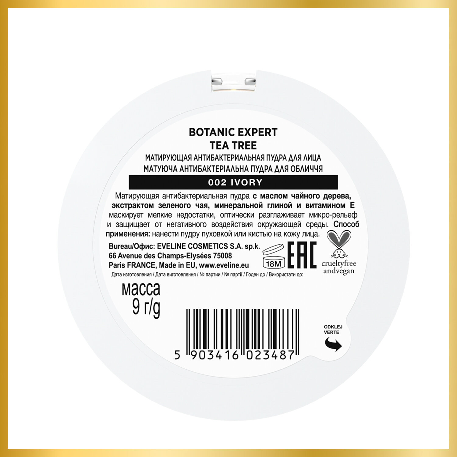 EVELINE Пудра для лица 3в1 BOTANIC EXPERT матирующая антибактериальная №002 - IVORY, 9 гр