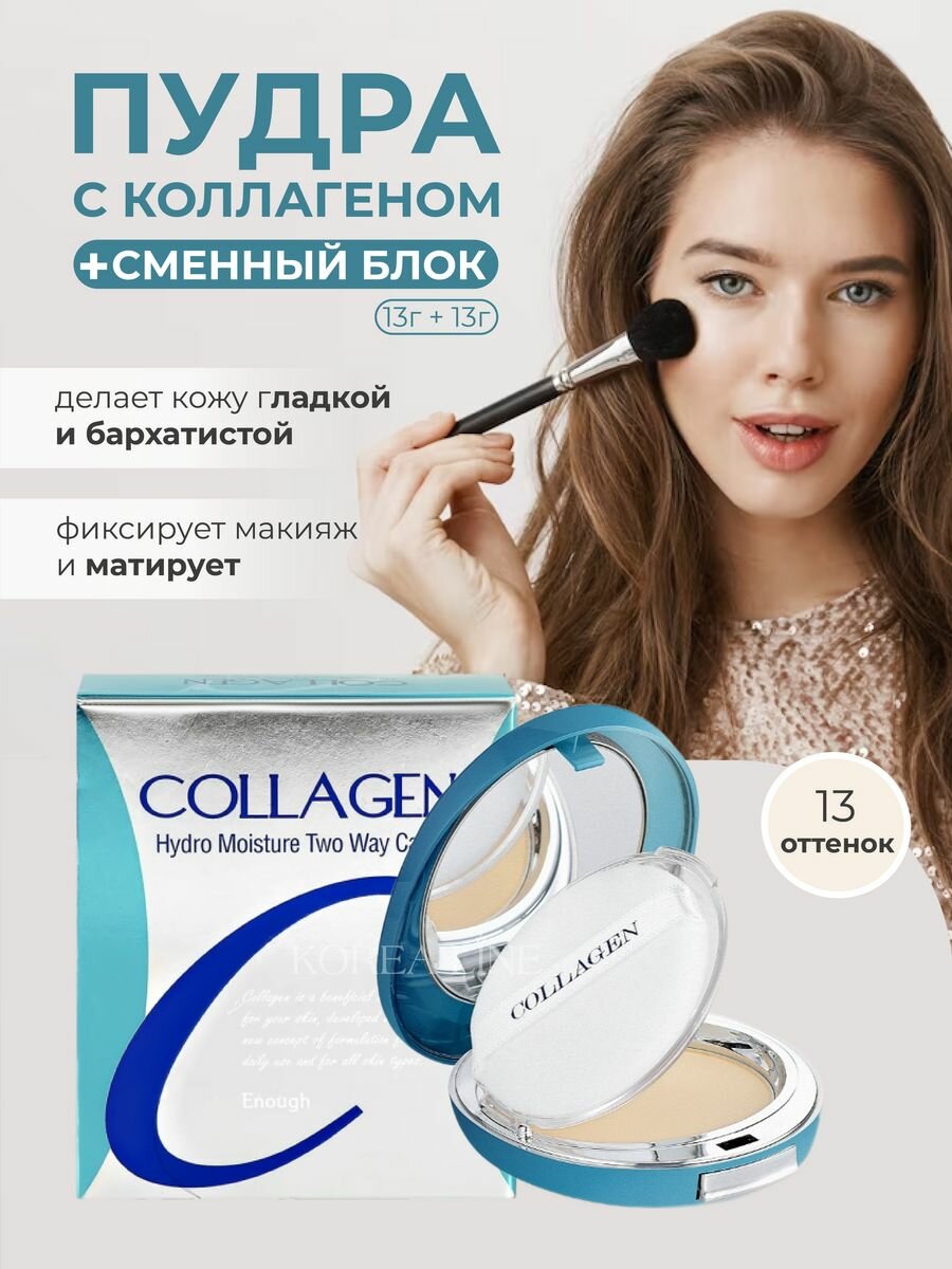 Увлажняющая пудра для лица с коллагеном ENOUGH COLLAGEN TWO WAY CAKE INCLUDING REFILL, со сменным блоком SPF25 тон 13