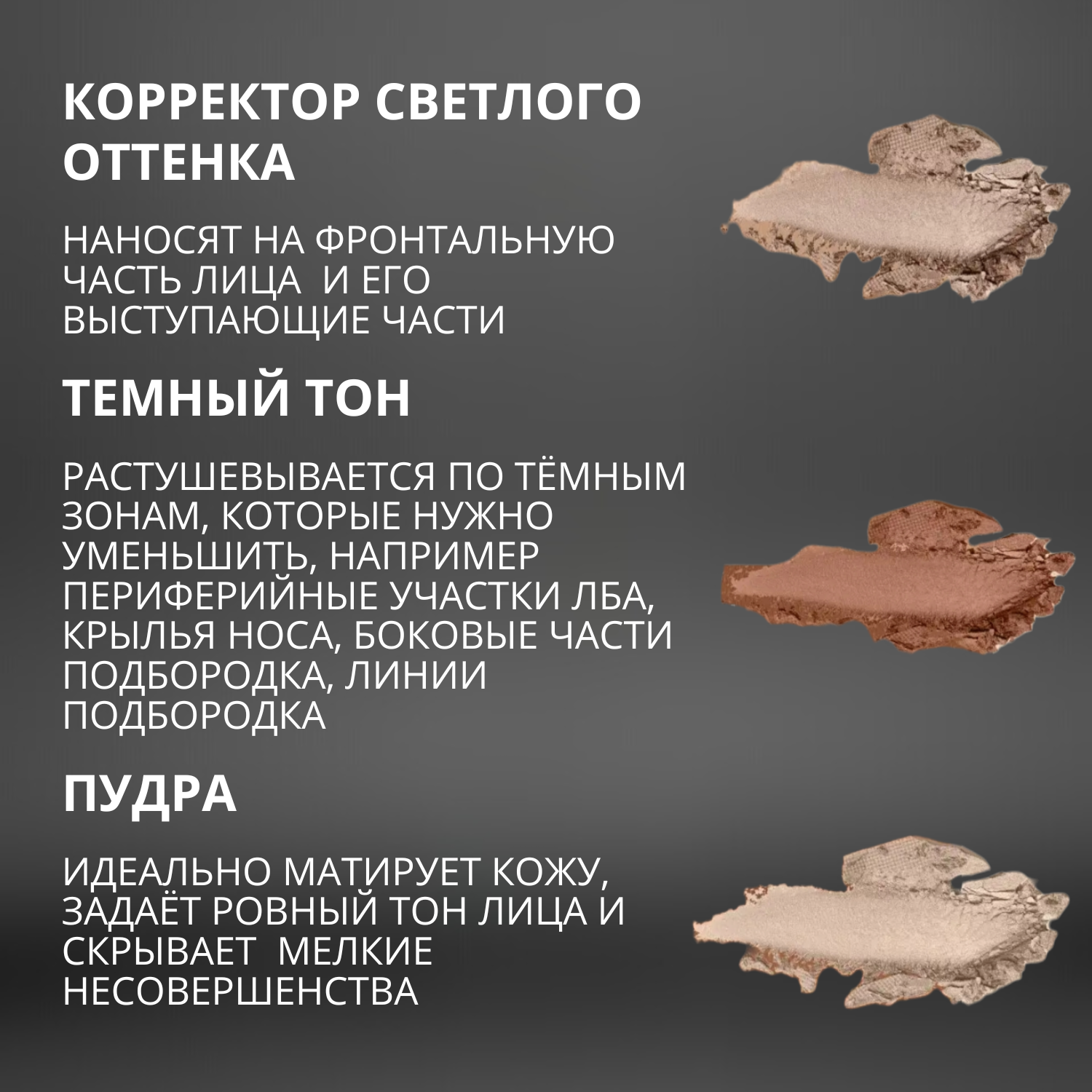 | Способ применения | Шаг 1. Bronzer (бронзер) нанести на виски, под скулы, вдоль линии подбородка, чтобы акцентировать черты лица и сделать тон кожи более теплым. Нанеси немного на боковые стороны носа, чтобы он казался тоньшеШаг2, Highlighter (хайлайтер) легкими движениями нанеси над скулами, на центр лба, подбородок и переносицу, чтобы придать лицу сияние.Шаг 3. Blusher (румяна) нанеси на скулы, немного растушевать- это придаст лицу здоровый и свежий внешний вид. |