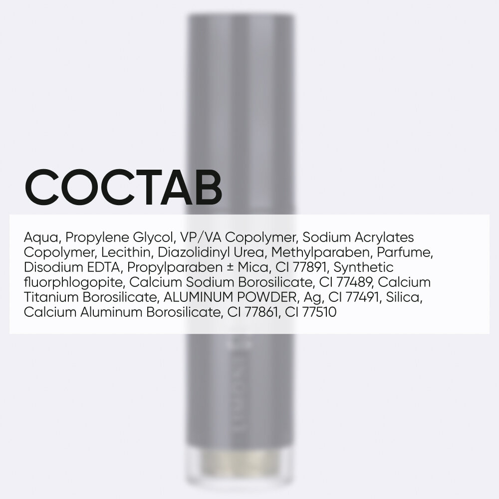 | Состав | Aqua, Propylene Glycol, VP/VA Copolymer, Sodium Acrylates Copolymer, Lecithin, Diazolidinyl Urea, Methylparaben, Parfume, Disodium EDTA, Propylparaben ± Mica, CI 77891, Synthetic fluorphlogopite, Calcium Sodium Borosilicate, CI 77489, Calcium Titanium Borosilicate, ALUMINUM POWDER, Ag, CI 77491, Silica, Calcium Aluminum Borosilicate, CI 77861, CI 77510 |