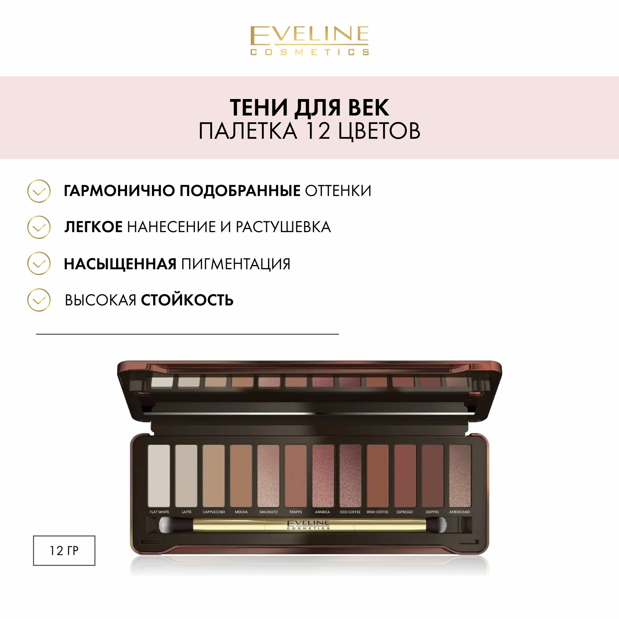 Тени для век Eveline Charming Mocha, 12 оттенков