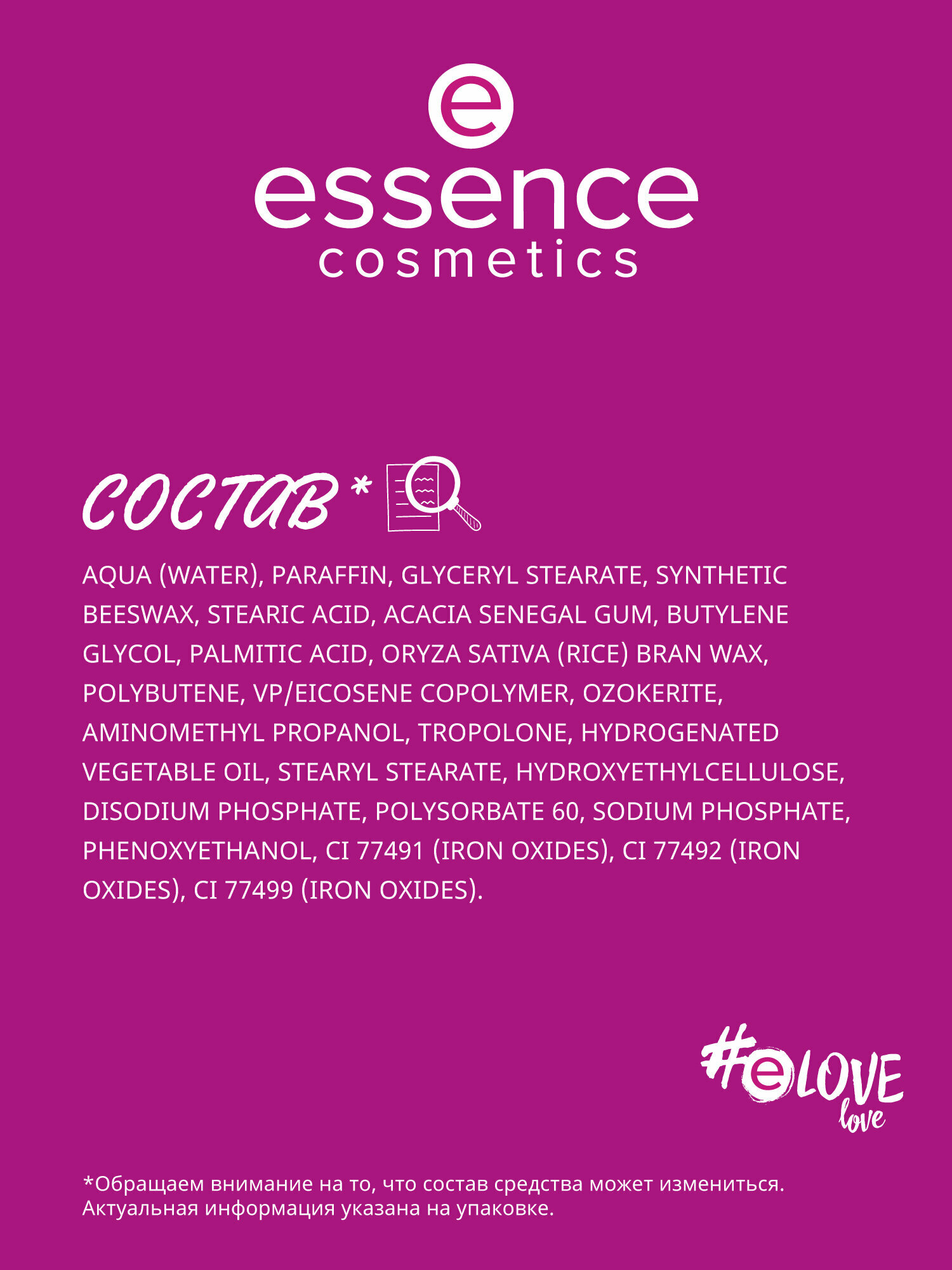 | Состав | AQUA (WATER), PARAFFIN, GLYCERYL STEARATE, SYNTHETIC BEESWAX, STEARIC ACID, ACACIA SENEGAL GUM, BUTYLENE GLYCOL, PALMITIC ACID, ORYZA SATIVA (RICE) BRAN WAX, POLYBUTENE, VP/EICOSENE COPOLYMER, OZOKERITE, AMINOMETHYL PROPANOL, TROPOLONE, HYDROGENATED VEGETABLE OIL, STEARYL STEARATE, HYDROXYETHYLCELLULOSE, DISODIUM PHOSPHATE, POLYSORBATE 60, SODIUM PHOSPHATE, PHENOXYETHANOL, CI 77491 (IRON OXIDES), CI 77492 (IRON OXIDES), CI 77499 (IRON OXIDES). |
