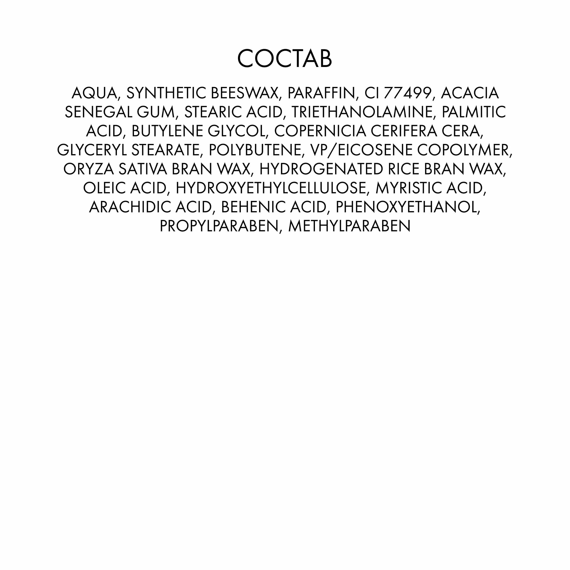 | Состав | Aqua, Synthetic Beeswax, Paraffin, CI 77499, Acacia Senegal Gum, Stearic Acid, Triethanolamine, Palmitic Acid, Butylene Glycol, Copernicia Cerifera Cera, Glyceryl Stearate, Polybutene, VP/Eicosene Copolymer, Oryza Sativa Bran Wax, Hydrogenated Rice Bran Wax, Hydroxyethylcellulose, Myristic Acid, Arachidic Acid, Behenic Acid, Oleic Acid, Phenoxyethanol, Methylparaben, Propylparaben. |