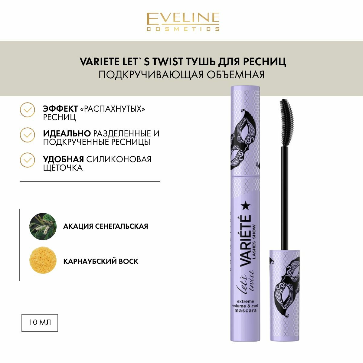 | Подробная комплектация | Тушь для ресниц Eveline Cosmetics, VARIETE LETS TWIST, подкручивающая, объемная, черная, 10 мл, 1 уп |