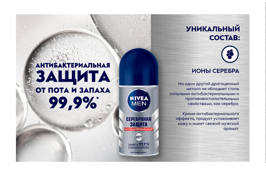 СохранитьДезодорант-антиперспирант шариковый NIVEA MEN "Серебряная защита" антибактериальный с ионами серебра, 50 мл. интересное: