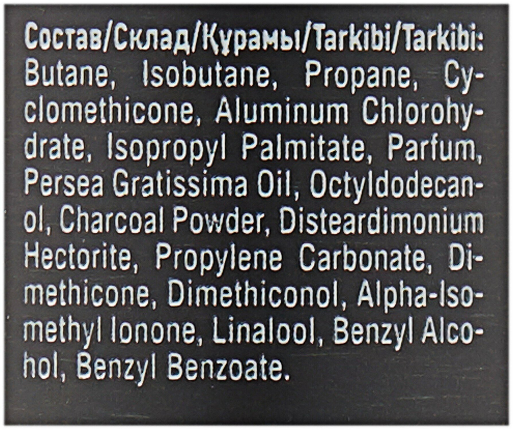| Состав | butane, isobutane, propane, cyclomethicone, aluminum chlorohydrate, isopropyl palmitate, parfum, persea gratissima oil, octyldodecanol, charcoal powder, disteardimonium hectorite, propylene carbonate, dimethicone, dimethiconol, alpha-isomethyl ionone, linalool, benzyl alcohol, benzyl benzoate |