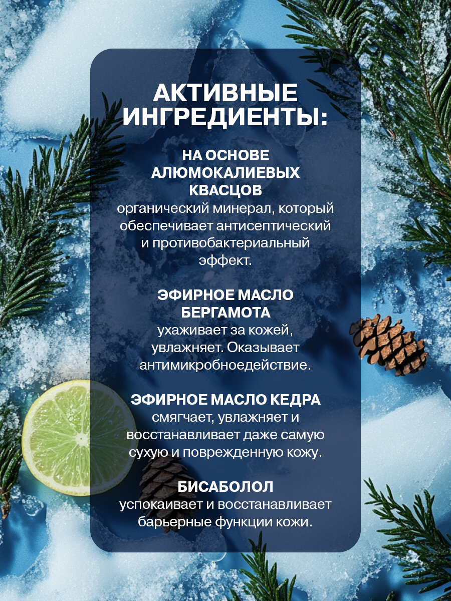| Состав | aqua (water), potassium alum, propylene glycol, PEG-40 hydrogenated castor oil, hydroxyethylcellulose, ethoxydiglycol, panthenol, parfum, aloe barbadensis (aloe vera) leaf juice extract, bisabolol, magnolia officinalis bark extract, citric acid, potassium sorbate, sodium benzoate, eugenol, linalool |