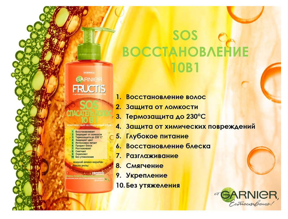GARNIER Комплексный несмываемый уход Fructis SOS Спасатель волос 10 в 1, 400 мл, бутылка интересное: