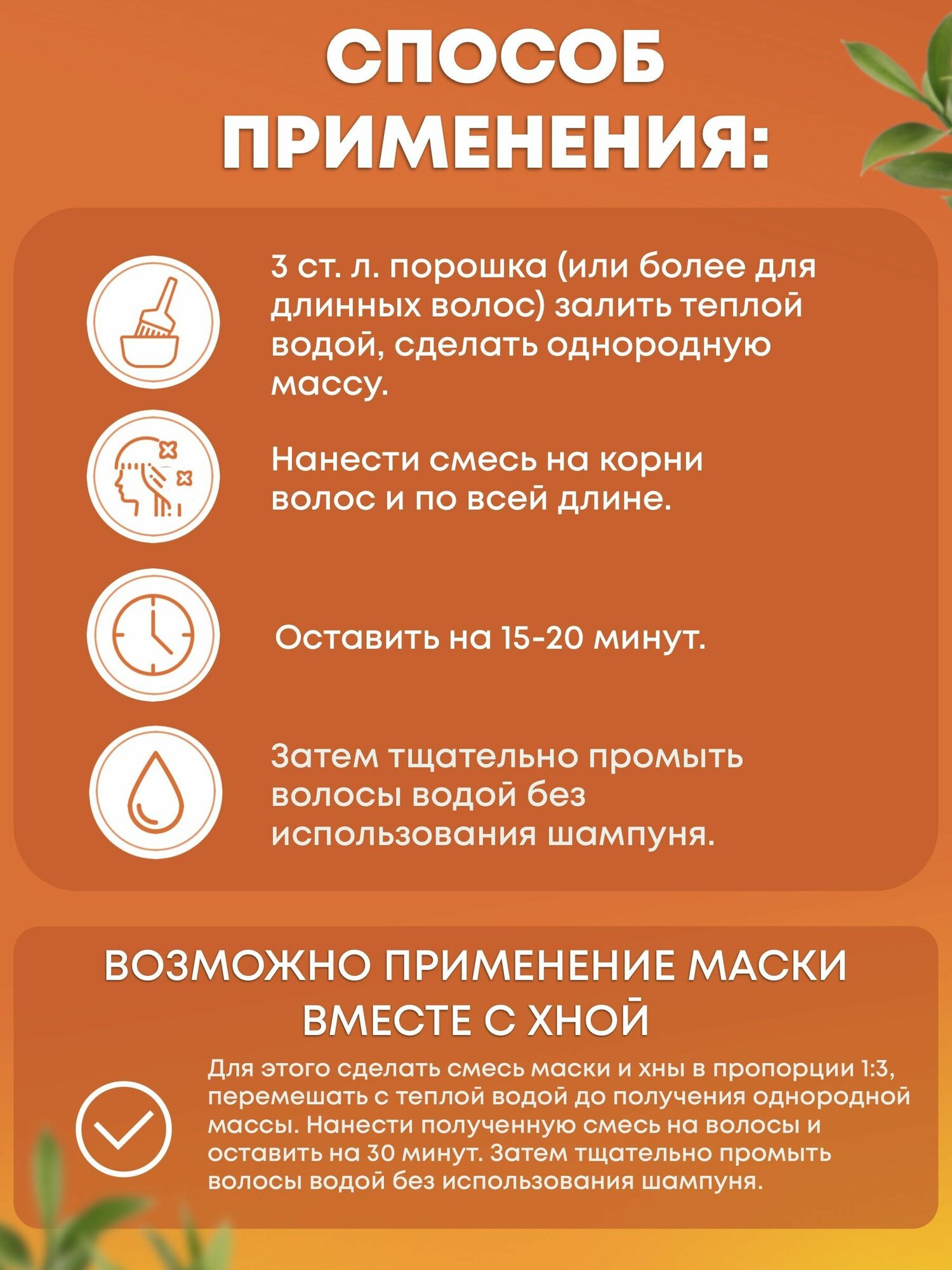 | Способ применения | косметическое средство можно использовать как самостоятельный продукт, так и в составе масок и окрашивающих растительных пигментов на основе хны. Чтобы сделать «шампунь» для короткой стрижки – берут 2 ст. ложки порошка и постепенно разводят подогретой до 21-25˚С водой. Для длинных волос, сухой компонент увеличивают вдвое. Смесь вымешивают до однородной массы, настаивают 20-30 минут, а потом наносят на голову. Через полчаса целебный состав смывают под прохладной проточной водой. Для приготовления маски, берут 3 ст. ложки порошка и готовят травяную массу по тому же принципу, как и в первом случае. После нанесения маски, создают парниковый эффект. Через час средство выполаскивают в теплой воде. При использовании в качестве дополнительного компонента, эклипту простертую смешивают с хной в соотношении 1:3 |