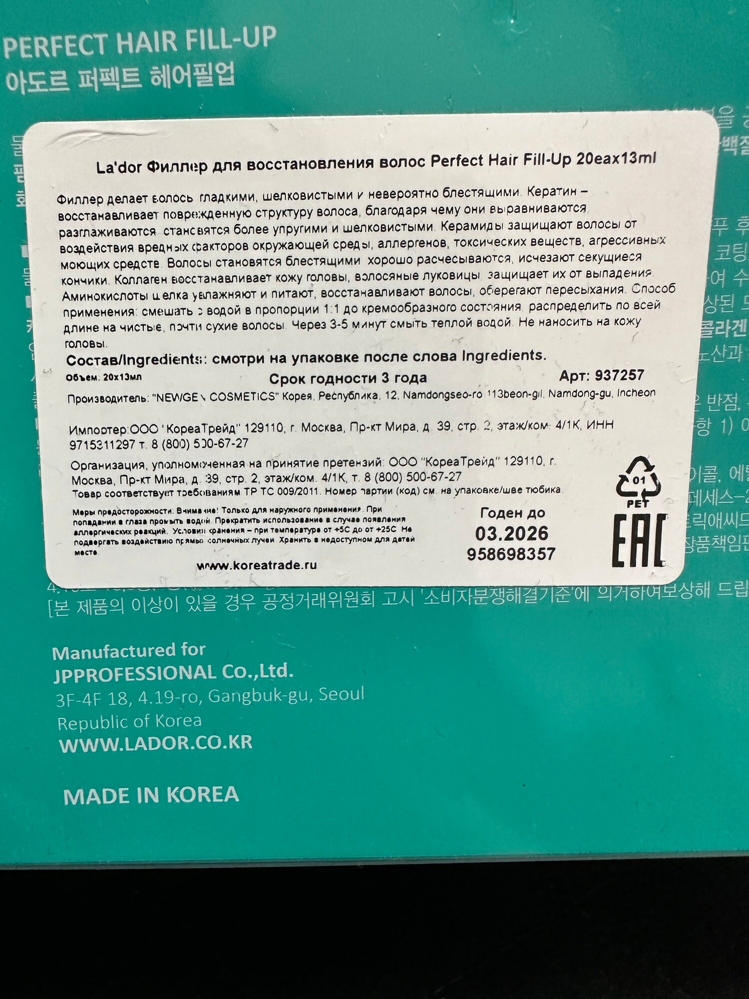 | Дополнительная информация | внутри флакона с филлером могу появиться белые хлопья; дело в том, что при пониженной температуре белок начинает сворачиваться и становится похож на хлопья, но стоит подержать средство в тепле, как оно опять становится водянистым и однородным |