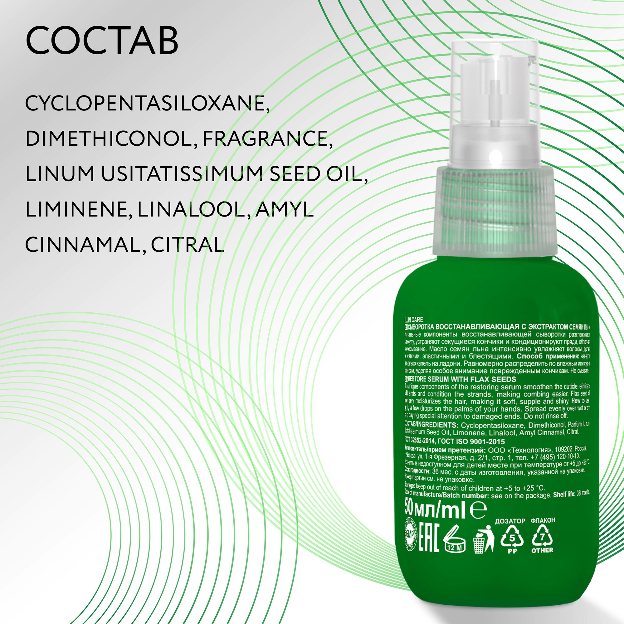 | Состав | cyclopentasiloxane, dimethiconol, fragrance, linum usitatissimum seed oil limonene, linalool, amyl cinnamal, citral |