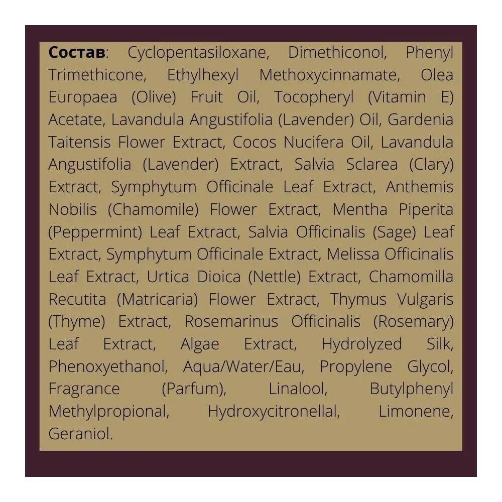 | Масла и экстракты | кокосовое масло / комплекс масел / комплекс экстрактов / масло лаванды / масло монои / масло ши (карите) / оливковое масло / экстракт крапивы / экстракт мелиссы / экстракт ромашки / экстракт шалфея |