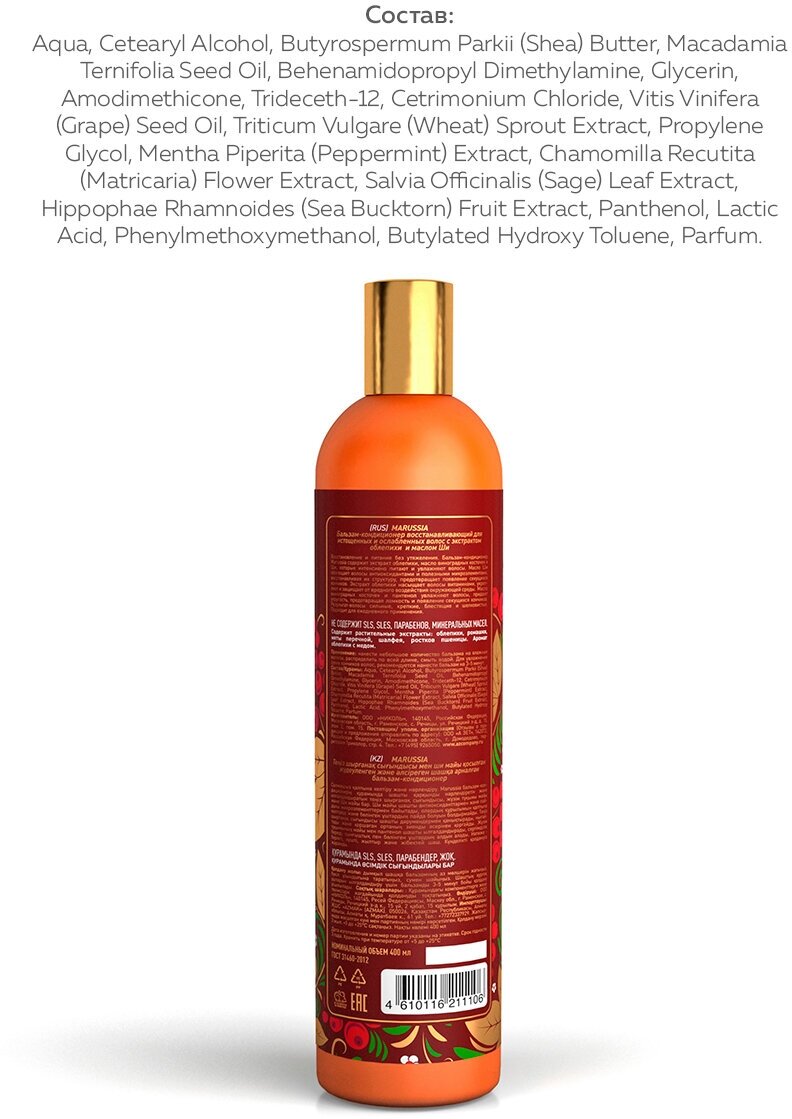 Marussia Бальзам - кондиционер для волос женский, мужской, восстанавливающий и увлажняющий с экстрактом облепихи и маслом ши, 400 мл