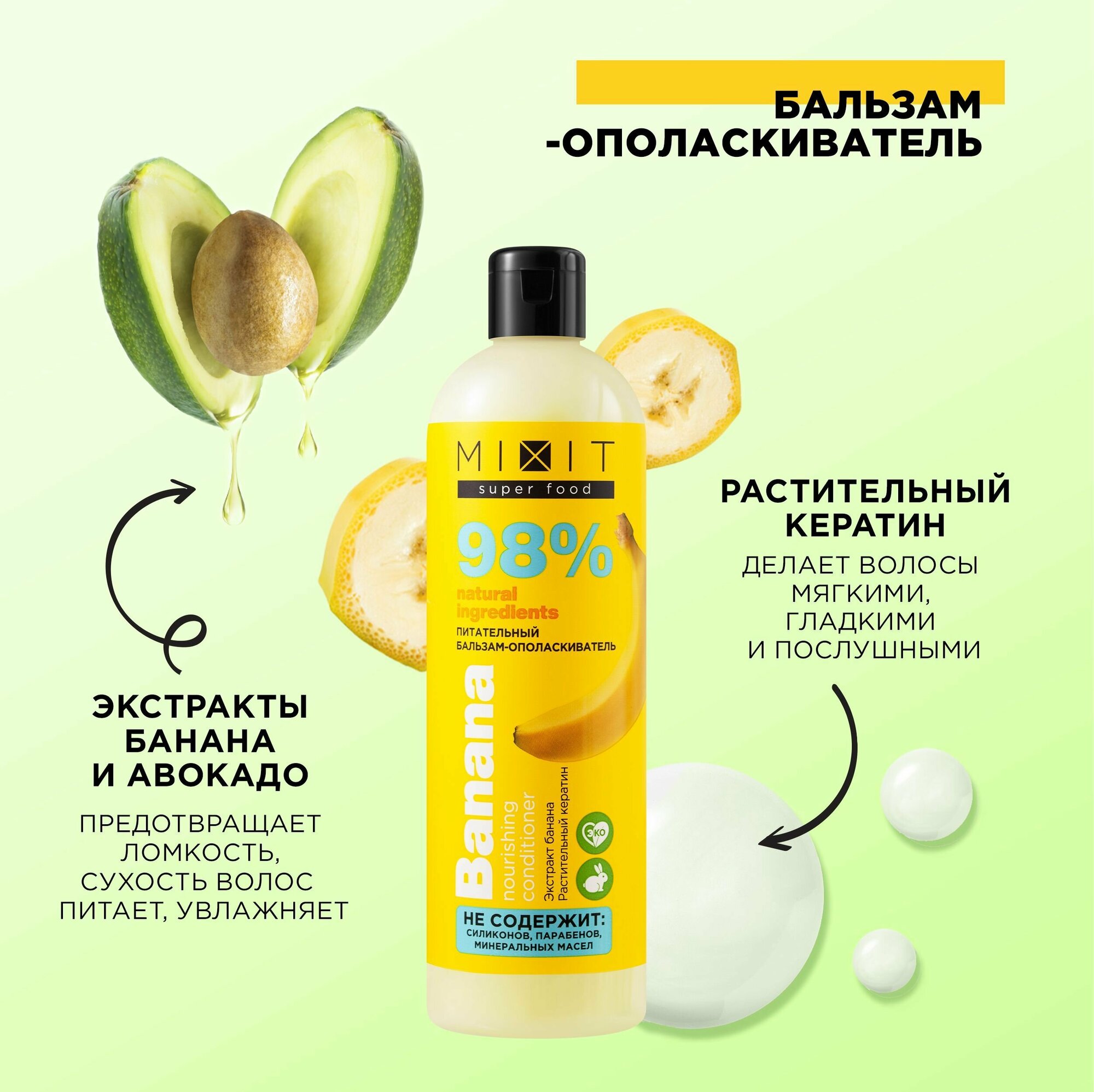 Питательный бальзам ополаскиватель для блеска и сияния волос, увлажняющее и восстанавливающее средство для ухода с кератином, маслом и экстрактом банана SUPER FOOD MixitSF, 400 мл
