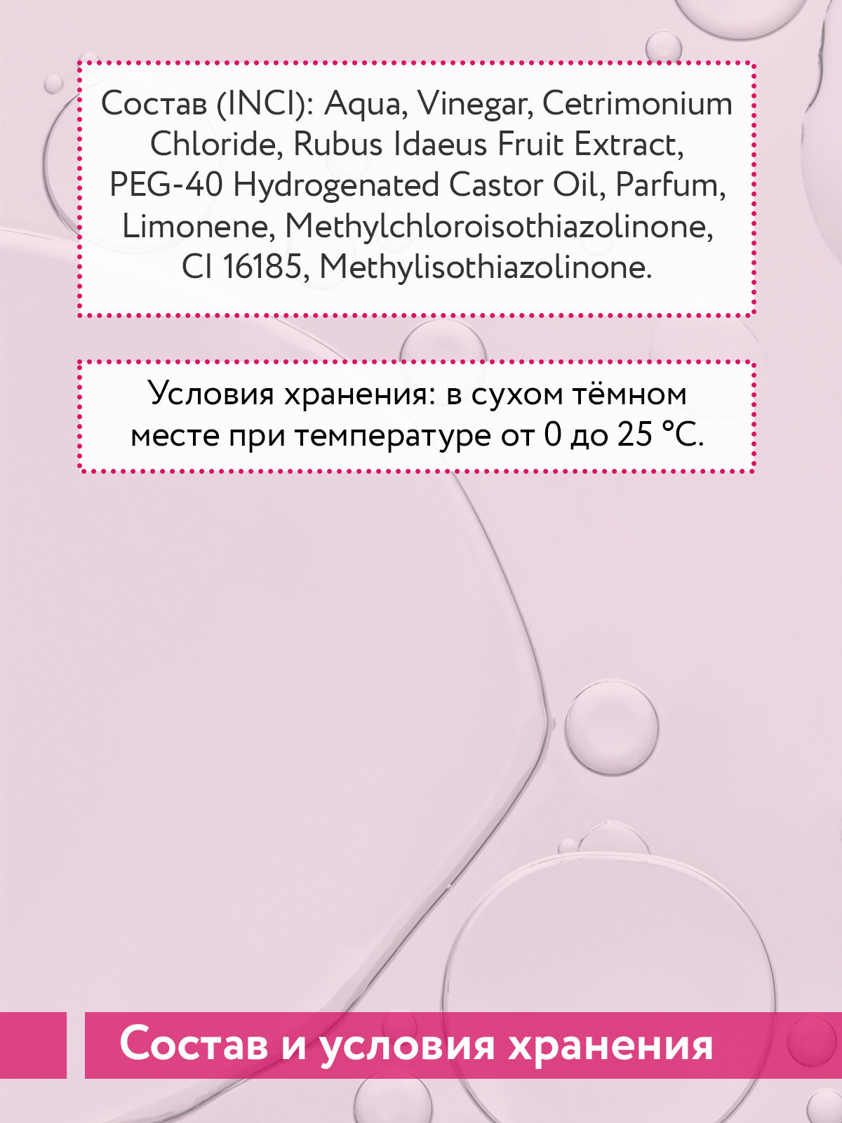 | Состав | Aqua, Vinegar, Cetrimonium Chloride, Rubus Idaeus Fruit Extract, PEG-40 Hydrogenated Castor Oil, Parfum, Limonene, Methylchloroisothiazolinone, CI 16185, Methylisothiazolinone. |