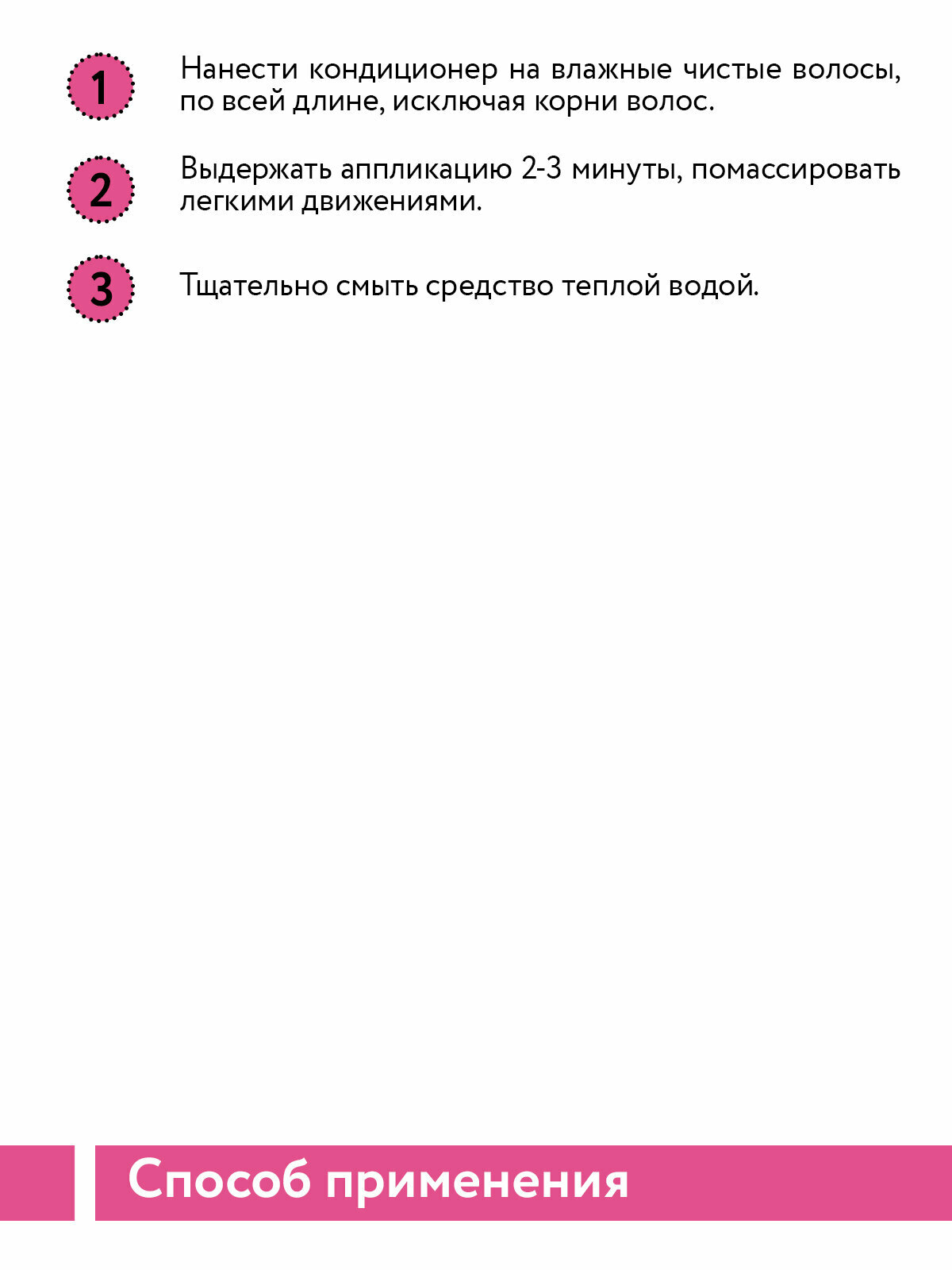| Способ применения | нанести на влажные чистые волосы по всей длине, исключая корни волос, выдержать 2-3 минуты, тщательно смыть средство теплой водой |