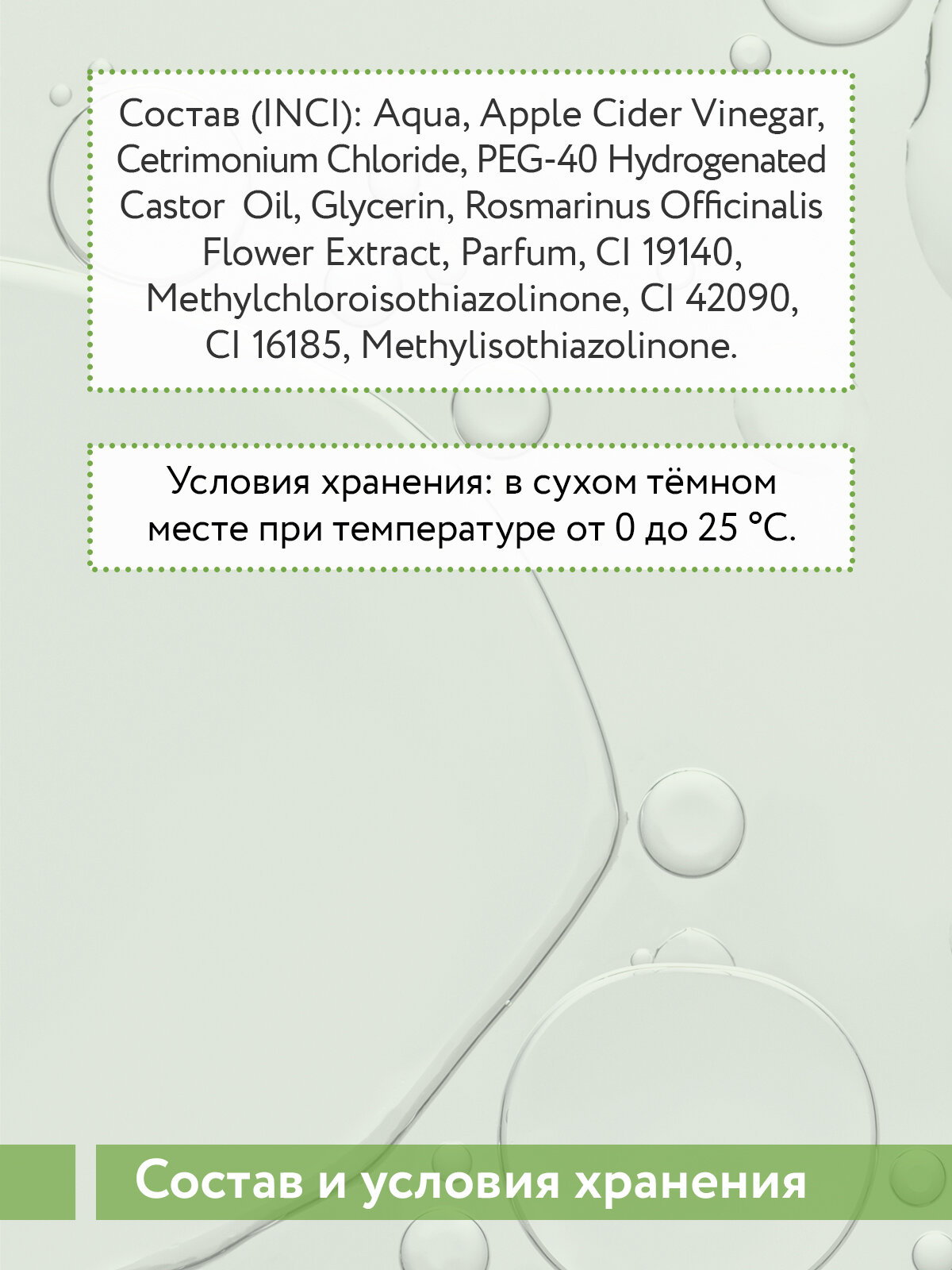 | Состав | Aqua, Apple Cider Vinegar, Cetrimonium Chloride, PEG-40 Hydrogenated Castor Oil, Glycerin, Rosmarinus Officinalis Flower Extract, Parfum, CI 19140, Methylchloroisothiazolinone, CI 42090, CI 16185, Methylisothiazolinone. |