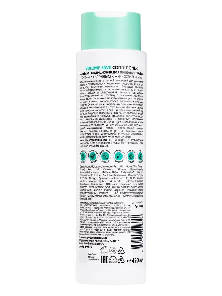 Бальзам-кондиционер ARAVIA PROFESSIONAL для придания объема тонким и склонным к жирности волосам Volume Save Conditioner, 400 мл